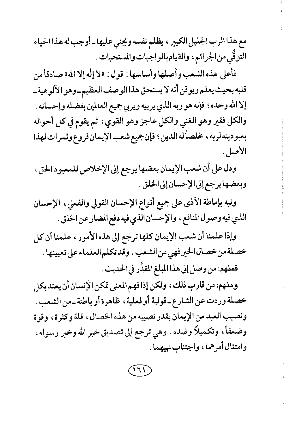 ودل على أن شعب الإيمان بعضها يرجع إلى الإخلاص للمعبود الحق، وبعضها يرجع إلى الإحسان إلى الخلق.