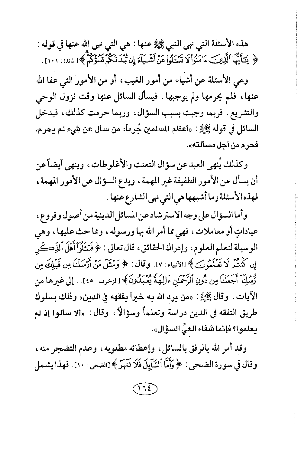 وكذلك ينهى العبد عن سؤال التعنت والأغلوطات، وينهى أيضا عن أن يسأل عن الأمور الطفيفة غير المهمة، ويدع السؤال عن الأمور المهمة، فهذه الأسئلة وما أشبهها هي التي نهى الشارع عنها.