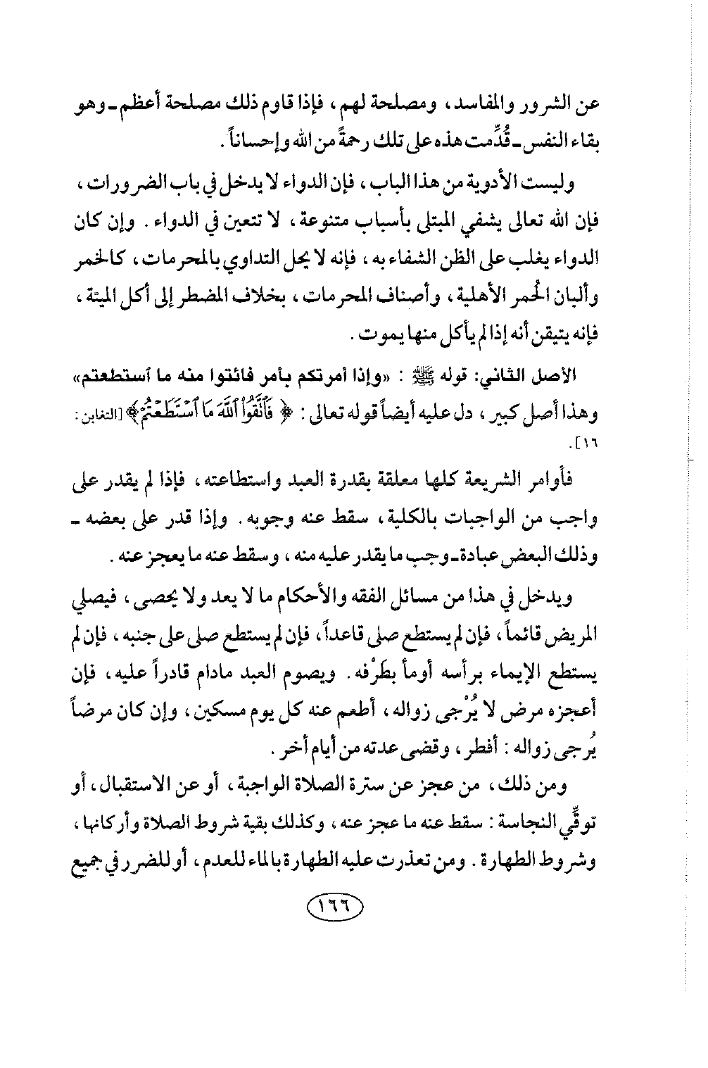 الأصل الثاني: قوله صلى الله عليه وسلم: «وَإِذَا أَمَرْتُكُمْ بِأَمْرٍ فَائْتُوا مِنْهُ مَا اسْتَطَعْتُمْ» وهذا أصل كبير، دل عليه أيضا قوله تعالى: {فَاتَّقُوا اللَّهَ مَا اسْتَطَعْتُمْ} [التغابن: 16]