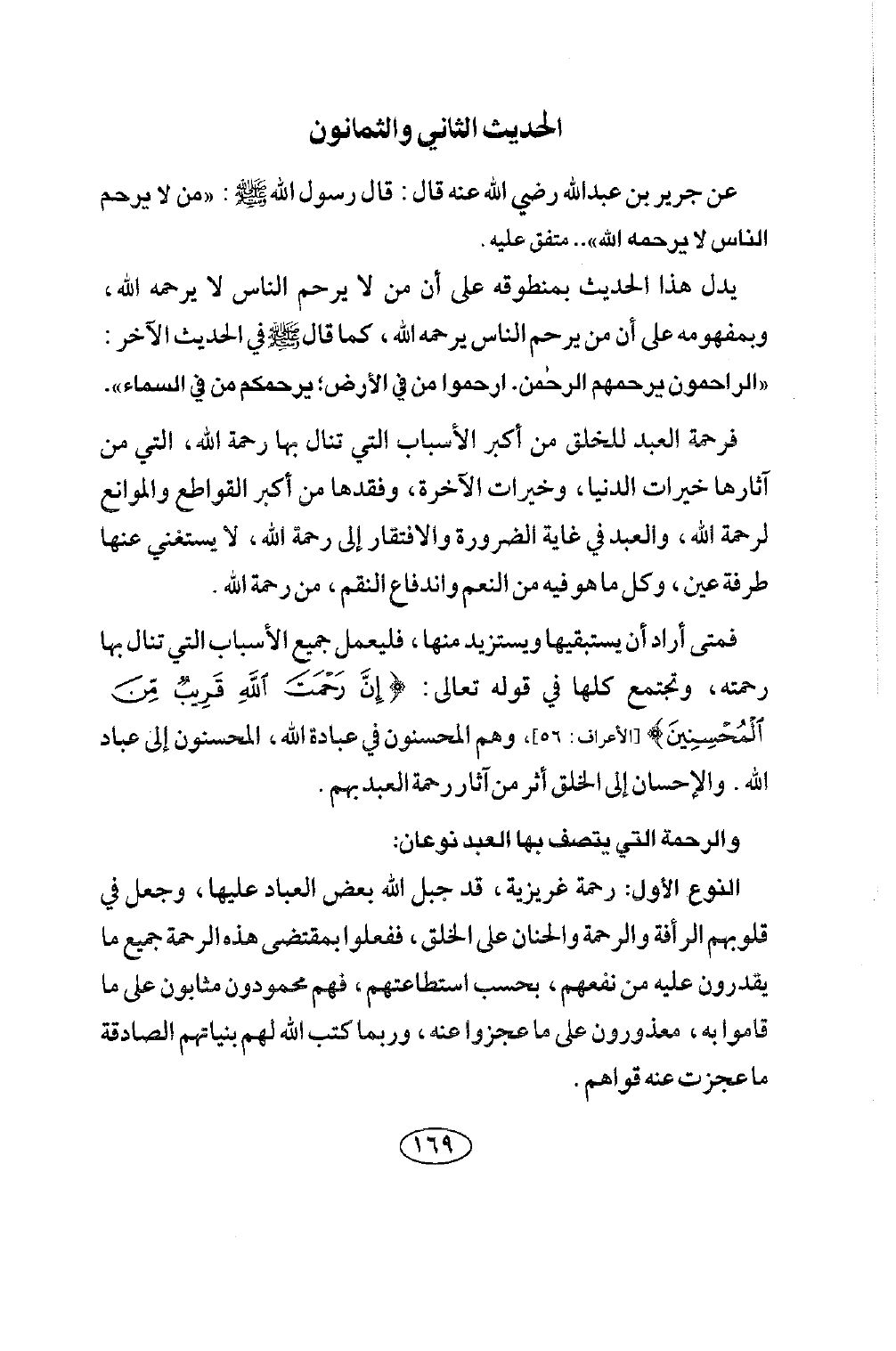 الحديث الثاني والثمانون عَنْ جَرِيرِ بْنِ عَبْدِ اللَّهِ رضي الله عنه قَالَ: قَالَ رَسُولُ اللَّهِ صلى الله عليه وسلم: «مَنْ لَا يَرْحَمِ النَّاسَ لَا يرحمه الله» . متفق عليه.
