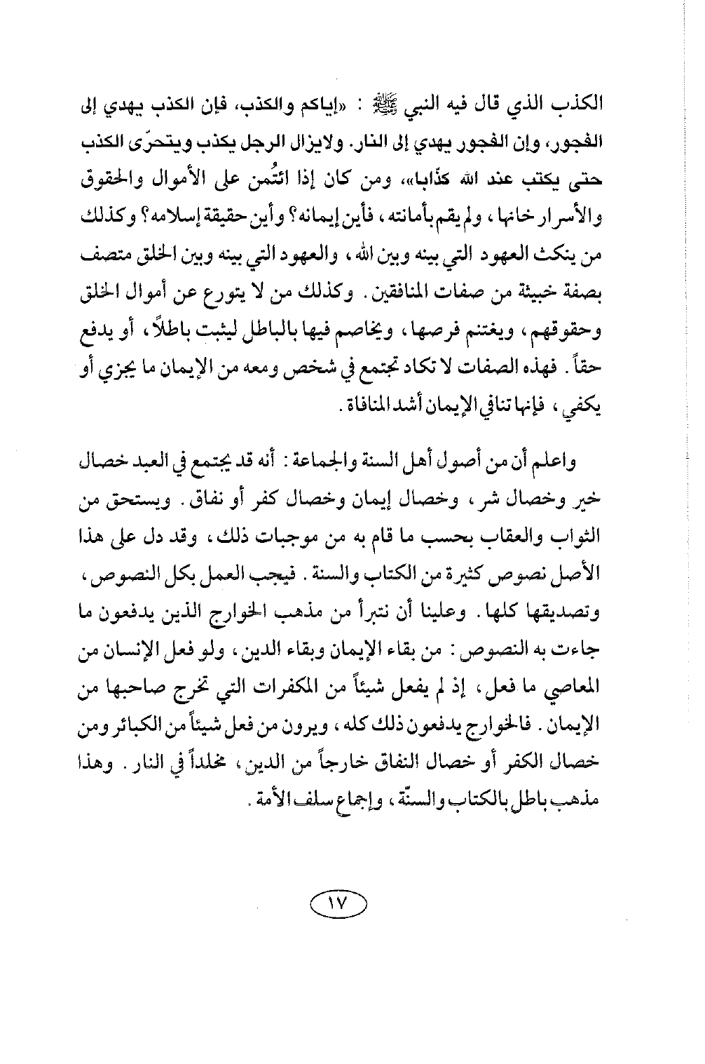 واعلم أن من أصول أهل السنة والجماعة: أنه قد يجتمع في العبد خصال خير وخصال شر، وخصال إيمان وخصال كفر أو نفاق. ويستحق من الثواب والعقاب بحسب ما قام به من موجبات ذلك وقد دل على هذا الأصل نصوص كثيرة من الكتاب والسنة، فيجب العمل بكل النصوص، وتصديقها كلها. وعلينا أن نتبرأ من مذهب الخوارج الذين يدفعون ما جاءت به النصوص: من بقاء الإيمان وبقاء الدين، ولو فعل الإنسان من المعاصي ما فعل، إذا لم يفعل شيئا من المكفرات التي تخرج صاحبها من الإيمان. فالخوارج يدفعون ذلك كله، ويرون من فعل شيئا من الكبائر ومن خصال الكفر أو خصال النفاق خارجا من الدين، مخلدا في النار. وهذا مذهب باطل بالكتاب والسنة، وإجماع سلف الأمة.