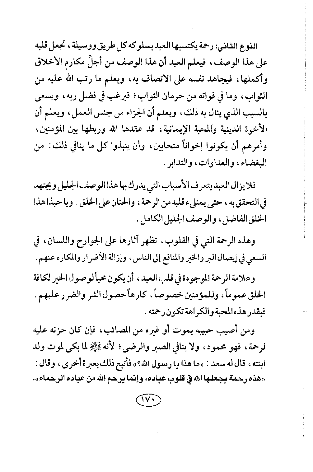 والنوع الثاني: رحمة يكتسبها العبد بسلوكه كل طريق ووسيلة، تجعل قلبه على هذا الوصف، فيعلم العبد أن هذا الوصف من أجل مكارم الأخلاق وأكملها، فيجاهد نفسه على الاتصاف به، ويعلم ما رتب الله عليه من الثواب، وما في فواته من حرمان الثواب ; فيرغب في فضل ربه، ويسعى بالسبب الذي ينال به ذلك. ويعلم أن الجزاء من جنس العمل. ويعلم أن الأخوة الدينية والمحبة الإيمانية، قد عقدها الله وربطها بين المؤمنين، وأمرهم أن يكونوا إخوانا متحابين، وأن ينبذوا كل ما ينافي ذلك من البغضاء، والعداوات، والتدابر.
