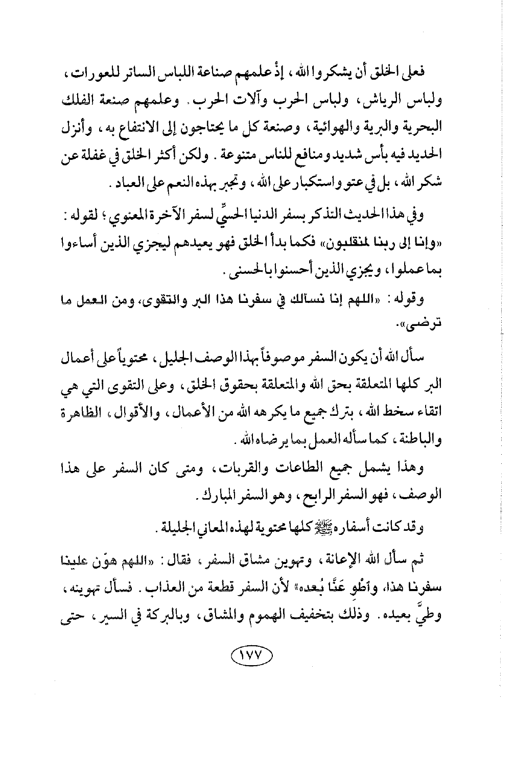 وفي هذا الحديث التذكر بسفر الدنيا الحسي لسفر الآخرة المعنوي، لقوله: «وإنا إلى ربنا لمنقلبون» فكما بدأ الخلق فهو يعيدهم ليجزي الذين أساءوا بما عملوا، ويجزي الذين أحسنوا بالحسنى.