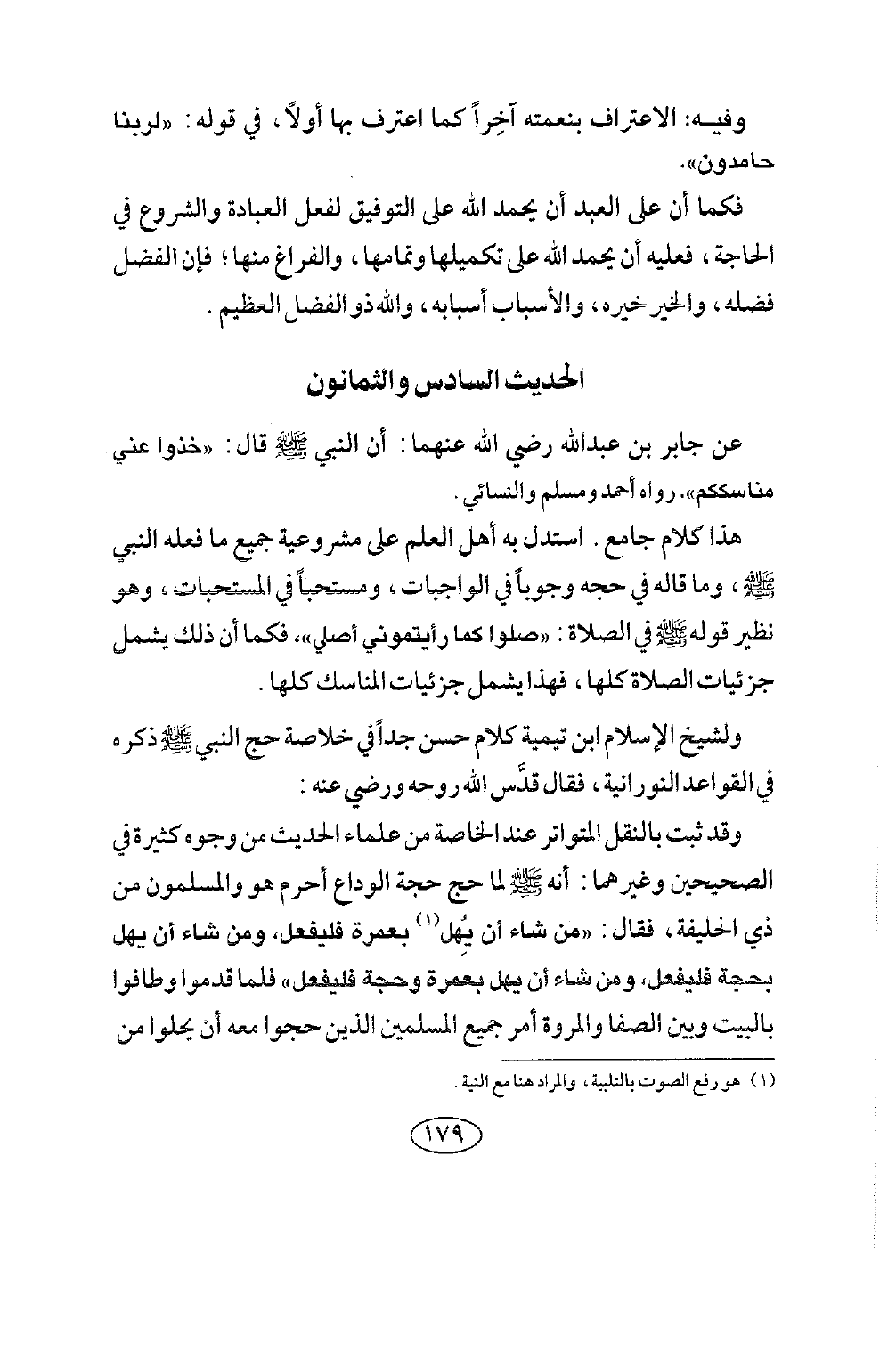 الحديث السادس والثمانون عن جابر بن عبد الله رضي الله عَنْهُمَا: أَنَّ النَّبِيَّ صلى الله عليه وسلم قَالَ: «خُذُوا عَنِّي مَنَاسِكَكُمْ» . رَوَاهُ أَحْمَدُ ومُسْلِمٌ والنسائي.