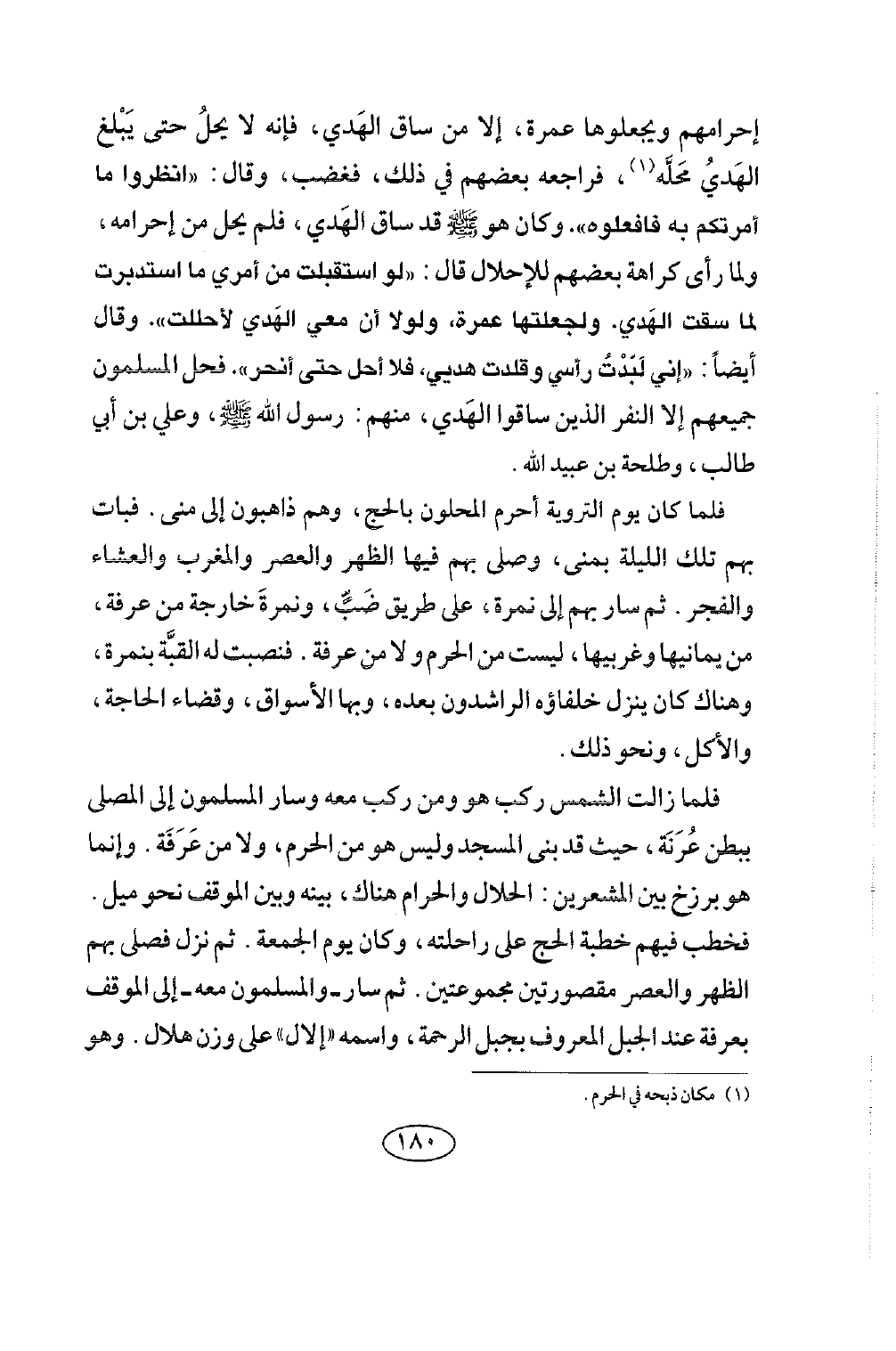 فلما كان يوم التروية أحرم المحلون بالحج، وهم ذاهبون إلى منى، فبات بهم تلك الليلة بمنى وصلى بهم فيها الظهر والعصر والمغرب والعشاء والفجر، ثم سار بهم إلى نمرة، على طريق ضب، ونمرة خارجة عن عرفة، من يمانيها وغربيها، ليست من الحرم، ولا من عرفة. فنصبت له القبة بنمرة. وهناك كان ينزل خلفاؤه الراشدون بعده، وبها الأسواق، وقضاء الحاجة، والأكل، ونحو ذلك.