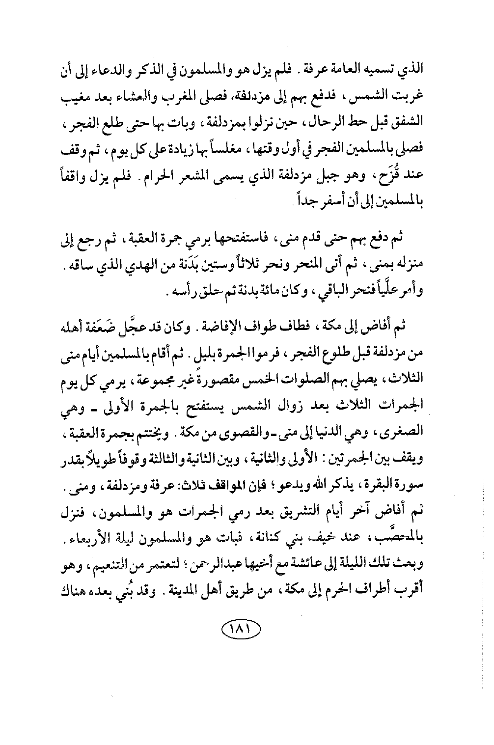 الذي تسميه العامة عرفة، فلم يزل هو والمسلمون في الذكر والدعاء إلى أن غربت الشمس، فدفع بهم إلى مزدلفة، فصلى المغرب والعشاء بعد مغيب الشفق قبل حط الرحال، حين نزلوا بمزدلفة، وبات بها حتى طلع الفجر، فصلى بالمسلمين الفجر في أول وقتها، مغلسا بها زيادة على كل يوم، ثم وقف عند قزح، وهو جبل مزدلفة الذي يسمى المشعر الحرام، فلم يزل واقفا بالمسلمين إلى أن أسفر جدا، ثم دفع بهم حتى قدم منى، فاستفتحها برمي جمرة العقبة، ثم رجع إلى منزله بمنى، ثم أتى المنحر ونحر ثلاثا وستين بدنة من الهدي الذي ساقه، وأمر عليا فنحر الباقي وكان مائة بدنة، ثم حلق رأسه.