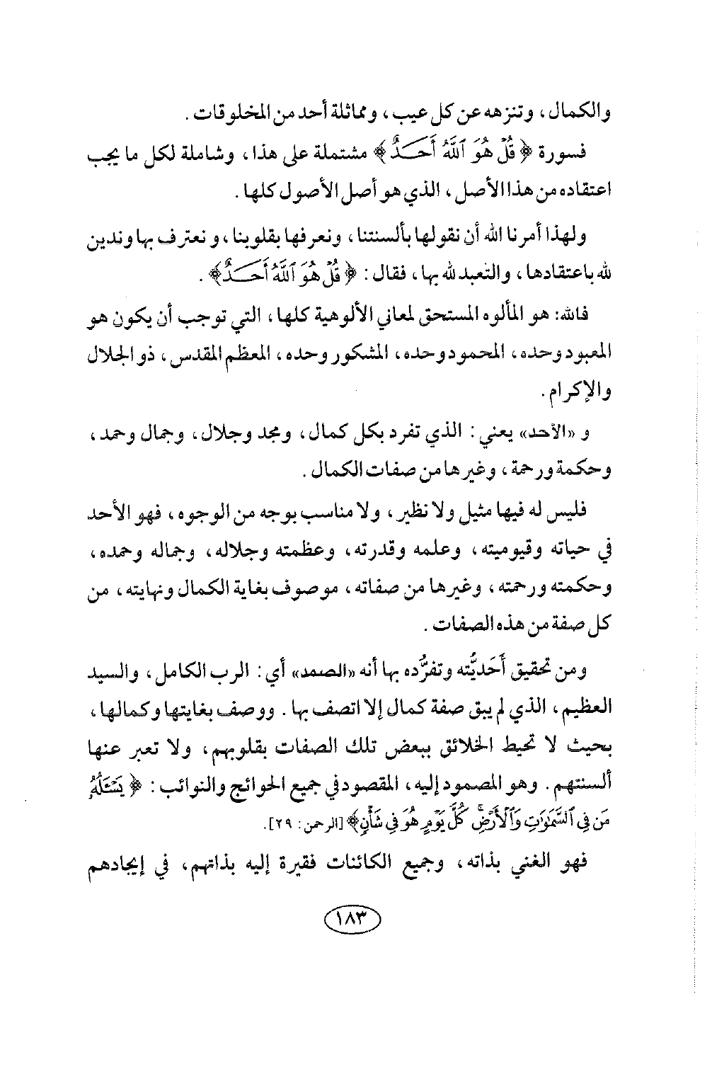 ومن تحقيق أحديته وتفرده بها أنه {الصَّمَدُ} [الإخلاص: 2] أي: الرب الكامل، والسيد العظيم، الذي لم يبق صفة كمال إلا اتصف بها. ووصف بغايتها وكمالها، بحيث لا تحيط الخلائق ببعض تلك الصفات بقلوبهم، ولا تعبر عنها ألسنتهم. وهو المصمود إليه، المقصود في جميع الحوائج والنوائب: {يَسْأَلُهُ مَنْ فِي السَّمَاوَاتِ وَالْأَرْضِ كُلَّ يَوْمٍ هُوَ فِي شَأْنٍ} [الرحمن: 29]