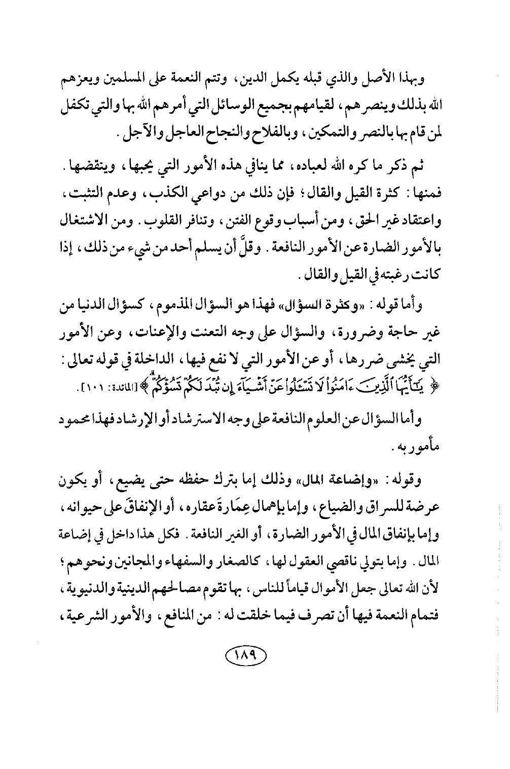 وأما قوله: «وكثرة السؤال» فهذا هو السؤال المذموم، كسؤال الدنيا من غير حاجة وضرورة، والسؤال على وجه التعنت والإعنات، وعن الأمور التي يخشى من ضررها، أو عن الأمور التي لا نفع فيها، الداخلة في قوله تعالى: {يَا أَيُّهَا الَّذِينَ آمَنُوا لَا تَسْأَلُوا عَنْ أَشْيَاءَ إِنْ تُبْدَ لَكُمْ تَسُؤْكُمْ} [المائدة: 101]