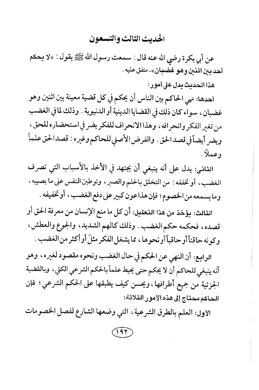 الحديث الثالث والتسعون عن أبي بكرة رضي الله عنه قَالَ: سَمِعْتُ رَسُولَ اللَّهِ صلى الله عليه وسلم يَقُولُ: «لَا يَحْكُمْ أَحَدٌ بَيْنَ اثْنَيْنِ وَهُوَ غَضْبَانُ» . مُتَّفَقٌ عَلَيْهِ.