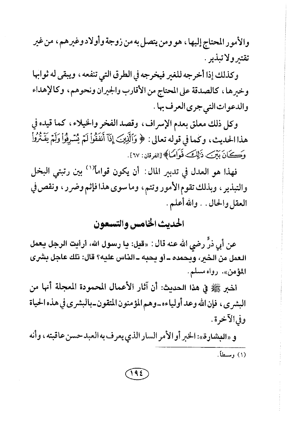 فهذا هو العدل في تدبير المال: أن يكون قواما (¬1) بين رتبتي البخل والتبذير، وبذلك تقوم الأمور وتتم. وما سوى هذا، فإثم وضرر، ونقص في العقل والحال. والله أعلم.