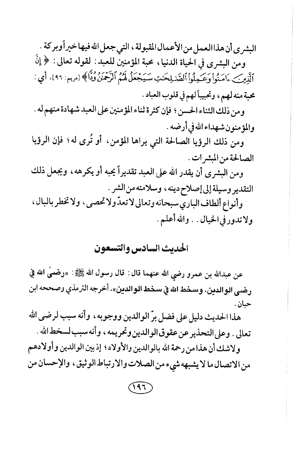 الحديث السادس والتسعون عن عبد الله بن عمرو رضي الله عَنْهُمَا قَالَ: قَالَ رَسُولُ اللَّهِ صلى الله عليه وسلم: «رِضَى اللَّهِ فِي رِضَى الْوَالِدَيْنِ، وَسَخَطُ اللَّهِ فِي سَخَطِ الْوَالِدَيْنِ» . أَخْرَجَهُ التِّرْمِذِيُّ. وصححه ابن حبان والحاكم.