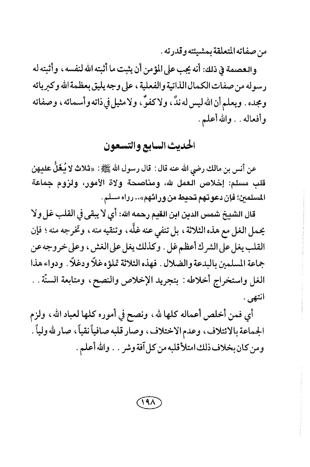 الحديث السابع والتسعون عَنْ أَنَسِ بْنِ مَالِكٍ رضي الله عنه قَالَ: قَالَ رَسُولُ اللَّهِ صلى الله عليه وسلم: «ثَلَاثٌ لَا يُغِلُّ عَلَيْهِنَّ قَلْبُ مُسْلِمٍ: إِخْلَاصُ الْعَمَلِ لِلَّهِ، وَمُنَاصَحَةُ وُلَاةِ الْأُمُورِ، وَلُزُومُ جَمَاعَةِ الْمُسْلِمِينَ، فَإِنَّ دَعْوَتَهُمْ تُحِيطُ مِنْ وَرَائِهِمْ» . رواه الترمذي والشافعي وغيرهما.
