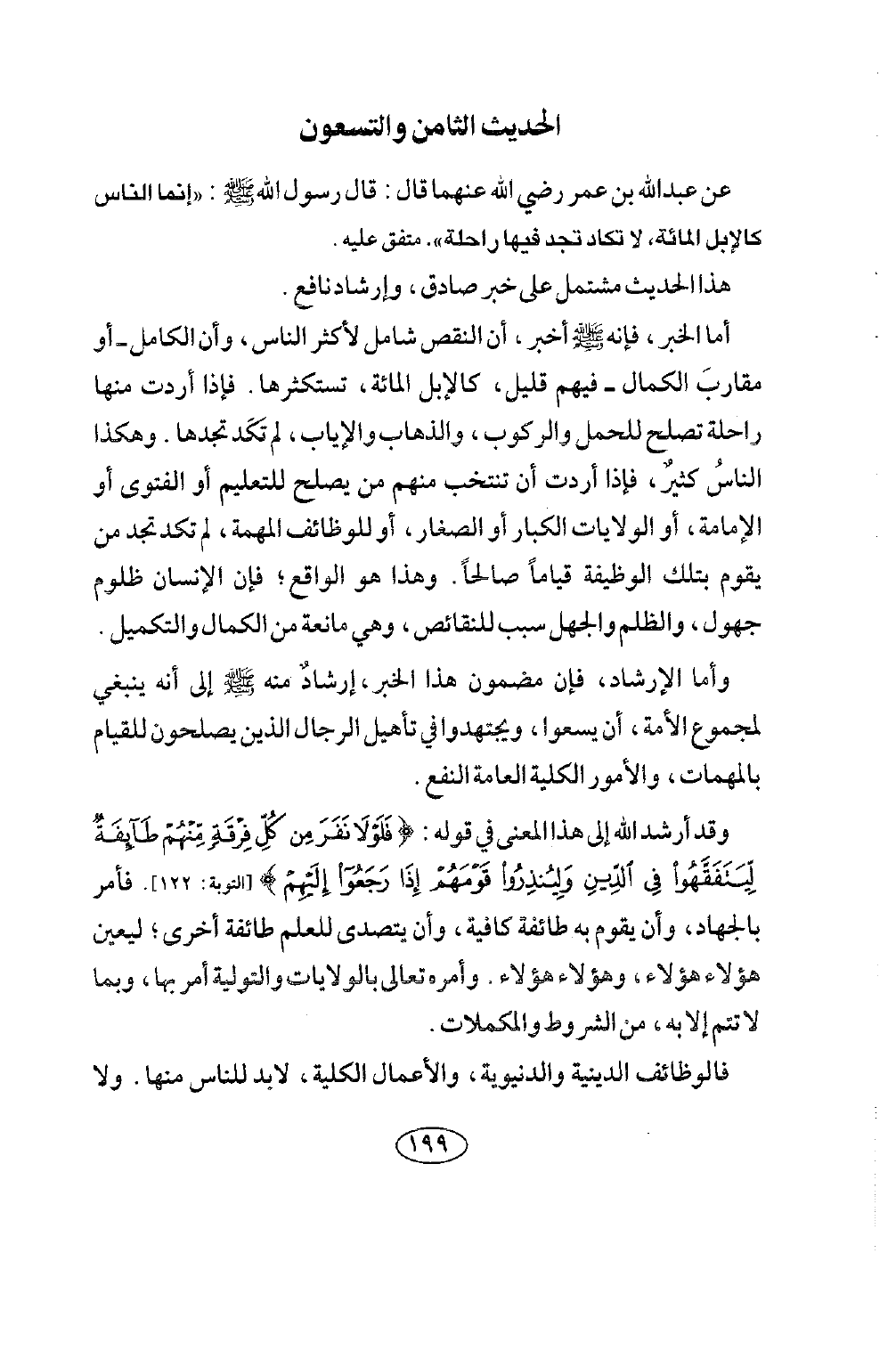 الحديث الثامن والتسعون عَنْ عَبْدِ اللَّهِ بْنِ عُمَرَ رَضِيَ اللَّهُ عَنْهُمَا قَالَ: قَالَ رَسُولُ اللَّهِ صلى الله عليه وسلم: «إِنَّمَا النَّاسُ كَالْإِبِلِ الْمِائَةِ، لَا تكاد تجد فيها راحلة» . متفق عليه.