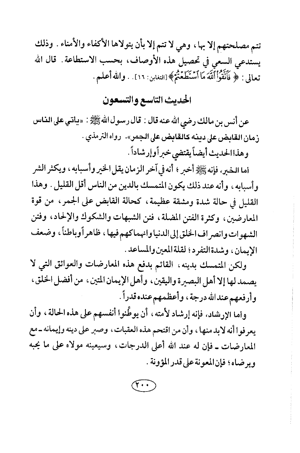 الحديث التاسع والتسعون عَنْ أَنَسِ بْنِ مَالِكٍ رضي الله عنه قَالَ: قَالَ رَسُولُ اللَّهِ صلى الله عليه وسلم: «يِأْتِي عَلَى النَّاسِ زَمَانٌ الْقَابِضُ عَلَى دينه كالقابض على الجمر» رواه الترمذي.