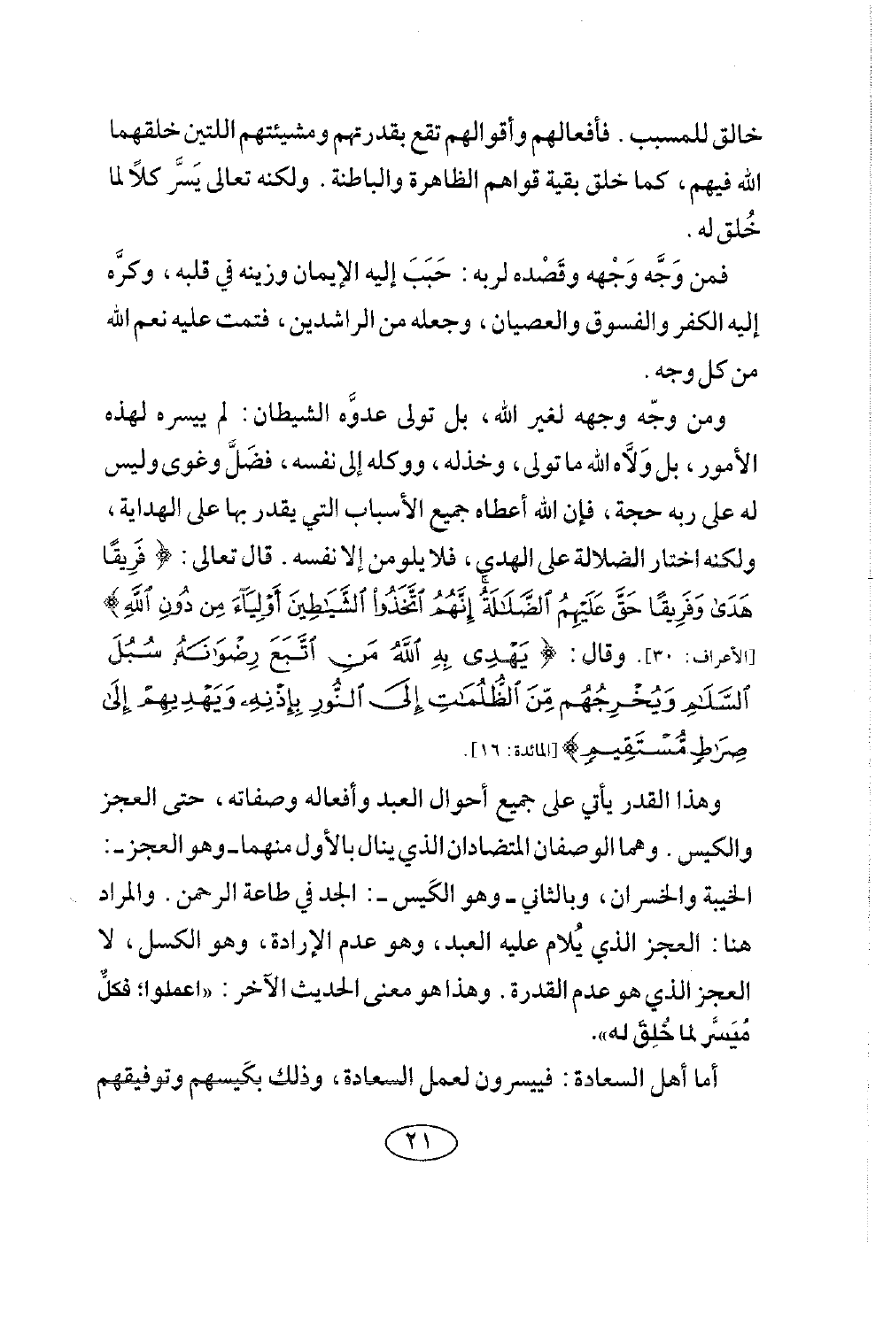 وهذا القدر يأتي على جميع أحوال العبد وأفعاله وصفاته، حتى العجز والكيس. وهما الوصفان المتضادان الذي ينال بالأول منهما - وهو العجز -: الخيبة والخسران، وبالثاني - وهو الكيس -: الجد في طاعة الرحمن. والمراد هنا: العجز الذي يلام عليه العبد، وهو عدم الإرادة، وهو الكسل، لا العجز الذي هو عدم القدرة. وهذا هو معنى الحديث الآخر «اعملوا ; فكل ميسر لما خلق له» .