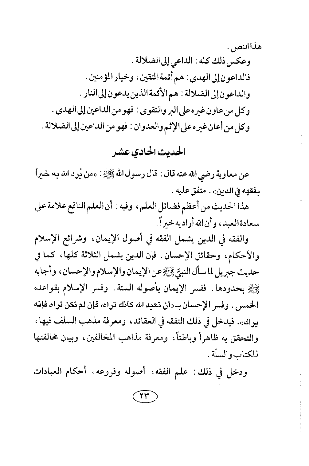 الحديث الحادي عشر عَنْ مُعَاوِيَةَ رضي الله عنه قَالَ: قَالَ رسول الله صلى الله عليه وسلم: «من يُرِدِ اللَّهُ بِهِ خَيْرًا يُفَقِّهْهُ فِي الدِّينِ» متفق عليه.