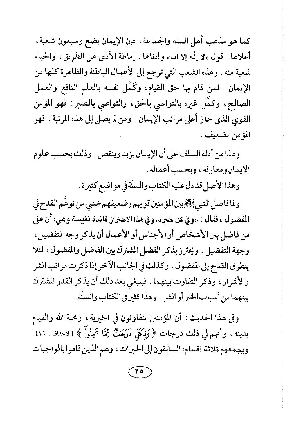 كما هو مذهب أهل السنة والجماعة ; فإن الإيمان بضع وسبعون شُعْبَةً، أَعْلَاهَا: قَوْلُ: (لَا إِلَهَ إِلَّا اللَّهُ) وَأَدْنَاهَا: إِمَاطَةُ الْأَذَى عَنِ الطَّرِيقِ، وَالْحَيَاءُ شُعْبَةٌ منه. وهذه الشعب التي ترجع إلى الأعمال الباطنة والظاهرة كلها من الإيمان. فمن قام بها حق القيام، وكمل نفسه بالعلم النافع والعمل الصالح، وكمل غيره بالتواصي بالحق، والتواصي بالصبر: فهو المؤمن القوي الذي حاز أعلى مراتب الإيمان، ومن لم يصل إلى هذه المرتبة: فهو المؤمن الضعيف.