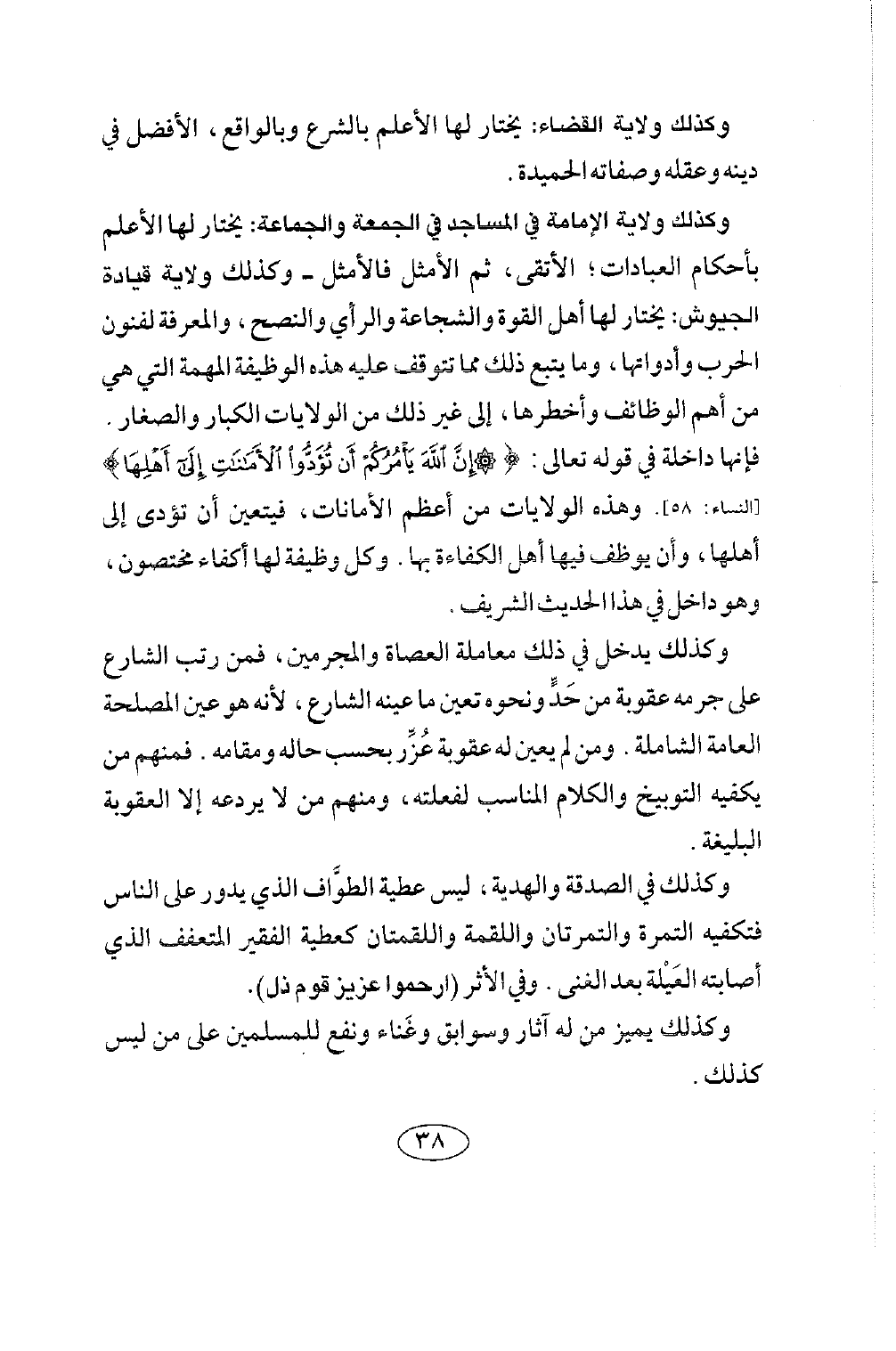 وكذلك ولاية الإمامة في المساجد في الجمعة والجماعة: يختار لها الأعلم بأحكام العبادات الأتقى، ثم الأمثل فالأمثل - وكذلك ولاية قيادة الجيوش: يختار لها أهل القوة والشجاعة والرأي والنصح، والمعرفة لفنون الحرب وأدواتها، وما يتبع ذلك مما تتوقف عليه هذه الوظيفة المهمة التي هي من أهم الوظائف وأخطرها، إلى غير ذلك من الولايات الكبار والصغار. فإنها داخلة في قوله تعالى: {إِنَّ اللَّهَ يَأْمُرُكُمْ أَنْ تُؤَدُّوا الْأَمَانَاتِ إِلَى أَهْلِهَا} [النساء: 58] وهذه الولايات من أعظم الأمانات. فيتعين أن تؤدى إلى أهلها، وأن يوظف فيها أهل الكفاءة بها، وكل وظيفة لها أكفاء مختصون، وهو داخل في هذا الحديث الشريف.