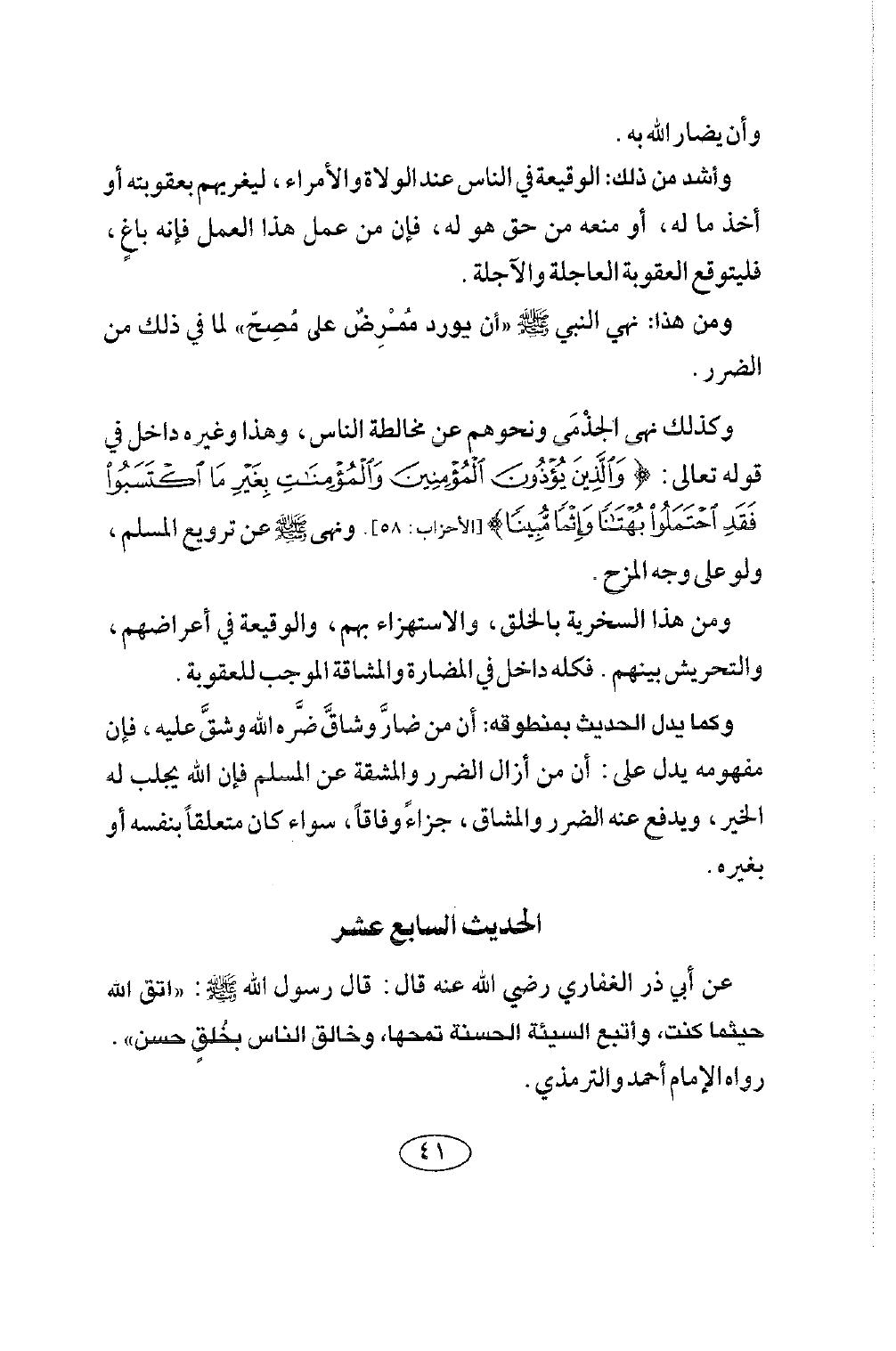 الحديث السابع عشر عَنْ أَبِي ذَرٍّ الْغِفَارِيِّ رضي الله عنه قَالَ: قَالَ رَسُولُ اللَّهِ صلى الله عليه وسلم: «اتَّقِ اللَّهَ حَيْثُمَا كُنْتَ، وَأَتْبِعِ السَّيِّئَةَ الْحَسَنَةَ تَمْحُهَا، وَخَالِقِ النَّاسَ بِخُلُقٍ حَسَنٍ» رَوَاهُ الإمام أحمد والترمذي.