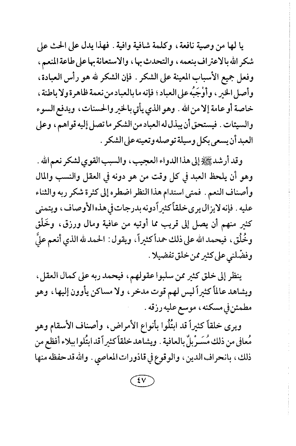 ويرى خلقا كثيرا قد ابتلوا بأنواع الأمراض، وأصناف الأسقام وهو معافى من ذلك، مسربل بالعافية. ويشاهد خلقا كثيرا قد ابتلوا ببلاء أفظع من ذلك، بانحراف الدين، والوقوع في قاذورات المعاصي، والله قد حفظه منها