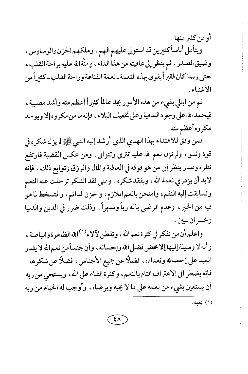 فمن وفق للاهتداء بهذا الهدي الذي أرشد إليه النبي صلى الله عليه وسلم لم يزل شكره في قوة ونمو، ولم تزل نعم الله عليه تترى وتتوالى. ومن عكس القضية فارتفع نظره وصار ينظر إلى من هو فوقه في العافية والمال والرزق وتوابع ذلك، فإنه لا بد أن يزدري نعمة الله، ويفقد شكره. ومتى فقد الشكر ترحلت عنه النعم، وتسابقت إليه النقم، وامتحن بالغم الملازم، والحزن الدائم، والتسخط لما هو فيه من الخير، وعدم الرضى بالله ربا ومدبرا. وذلك ضرر في الدين والدنيا وخسران مبين.