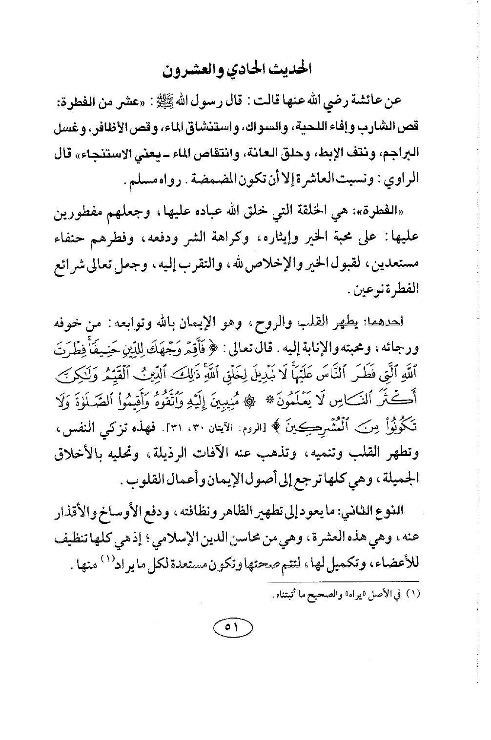 الحديث الحادي والعشرون عَنْ عَائِشَةَ رَضِيَ اللَّهُ عَنْهَا قَالَتْ: قَالَ رَسُولُ اللَّه صلى الله عليه وسلم: «عَشْرٌ مِنَ الْفِطْرَةِ: قَصُّ الشَّارِبِ، وَإِعْفَاءُ اللِّحْيَةِ، وَالسِّوَاكُ، واستنشاق الماء، وقص الأظافر، وَغَسْلُ الْبَرَاجِمِ، وَنَتْفُ الْإِبْطِ، وَحَلْقُ الْعَانَةِ، وَانْتِقَاصُ الْمَاءِ، يَعْنِي الِاسْتِنْجَاءَ» قَالَ الرَّاوِي: وَنَسِيتُ الْعَاشِرَةَ إلا أن تكون المضمضة. رواه مسلم.