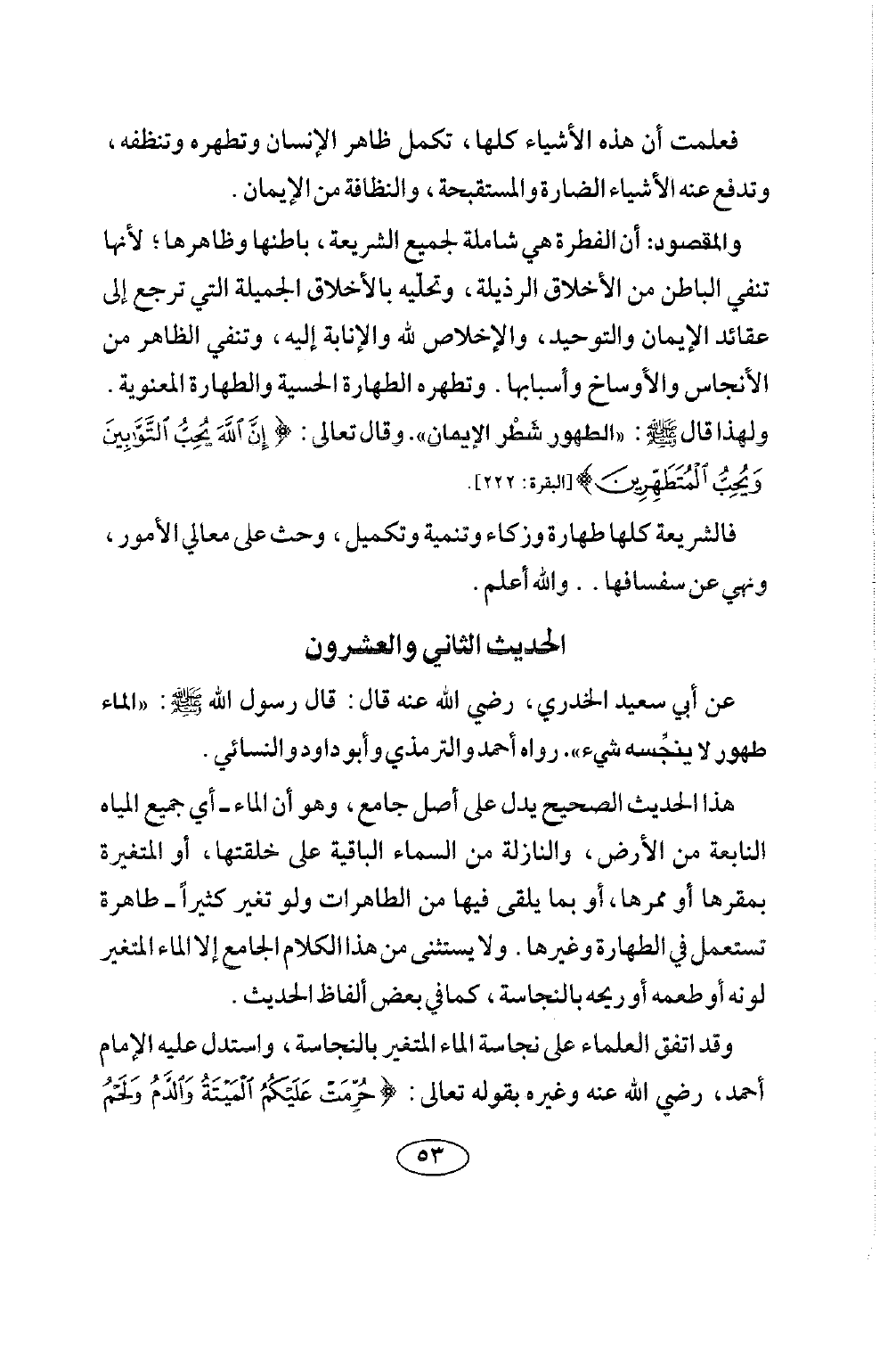 الحديث الثاني والعشرون عَنْ أَبِي سَعِيدٍ الْخُدْرِيِّ، رضي الله عنه قَالَ: قَالَ رَسُولُ اللَّهِ صلى الله عليه وسلم: «الْمَاءُ طَهُورٌ لَا يُنَجِّسُهُ شَيْءٌ» . رَوَاهُ أحمد والترمذي وأبو داود والنسائي.