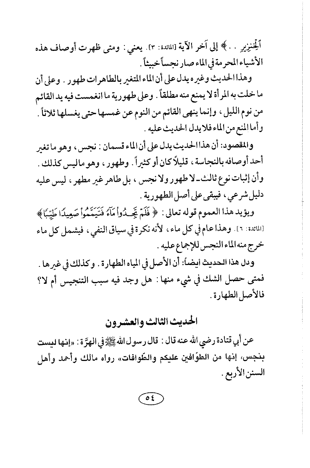 الحديث الثالث والعشرون عَنْ أَبِي قَتَادَةَ رضي الله عنه قَالَ: قال رسول الله صلى الله عليه وسلم فِي الْهِرَّةِ: «إِنَّهَا لَيْسَتْ بِنَجِسٍ، إِنَّهَا مِنَ الطَّوَّافِينَ عَلَيْكُمْ وَالطَّوَّافَاتِ» رَوَاهُ مَالِكٌ وَأَحْمَدُ وَأَهْلُ السنن الأربع.