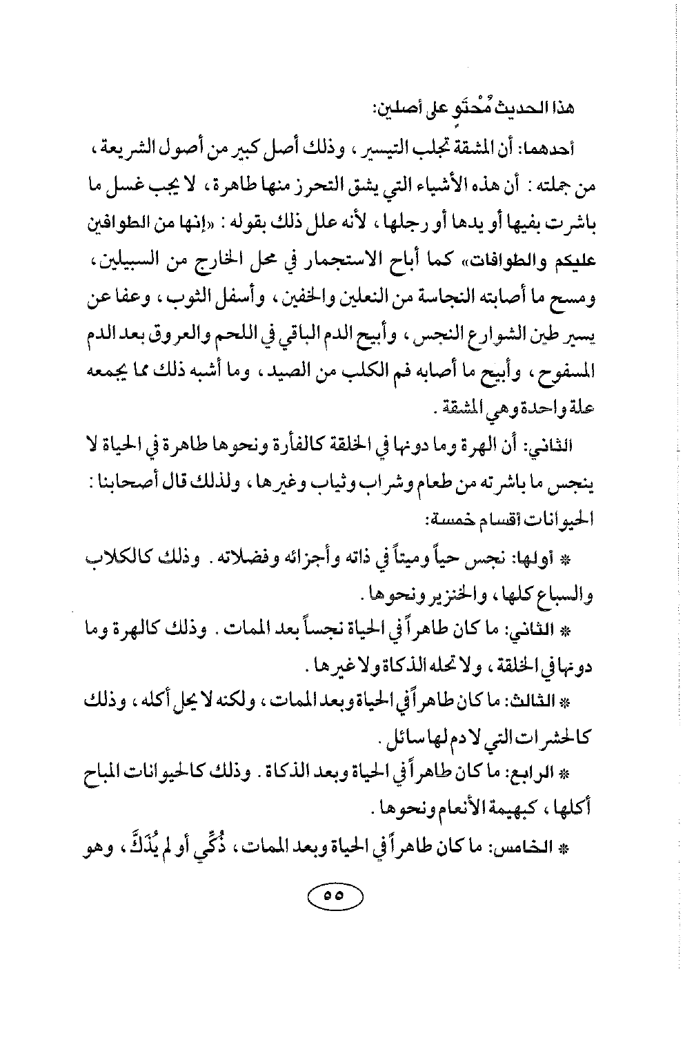 أحدهما: أن المشقة تجلب التيسير، وذلك أصل كبير من أصول الشريعة، من جملته: أن هذه الأشياء التي يشق التحرز منها طاهرة، لا يجب غسل ما باشرت بفيها أو يدها أو رجلها، لأنه علل ذلك بقوله: «إنها من الطوافين عليكم والطوافات» كما أباح الاستجمار في محل الخارج من السبيلين، ومسح ما أصابته النجاسة من النعلين والخفين، وأسفل الثوب، وعفا عن يسير طين الشوارع النجس، وأبيح الدم الباقي في اللحم والعروق بعد الدم المسفوح، وأبيح ما أصابه فم الكلب من الصيد، وما أشبه ذلك مما يجمعه علة واحدة، وهي المشقة.