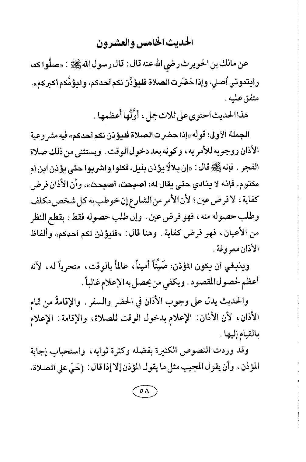 الحديث الخامس والعشرون عَنْ مَالِكِ بْنِ الْحُوَيْرِثِ رضي الله عنه قَالَ: قَالَ رَسُولُ اللَّهِ صلى الله عليه وسلم: «صَلُّوا كَمَا رَأَيْتُمُونِي أُصَلِّي، وَإِذَا حَضَرَتِ الصَّلَاةُ فَلْيُؤَذِّنْ لَكُمْ أَحَدُكُمْ، وَلْيَؤُمَّكُمْ أَكْبَرُكُمْ» مُتَّفَقٌ عليه.