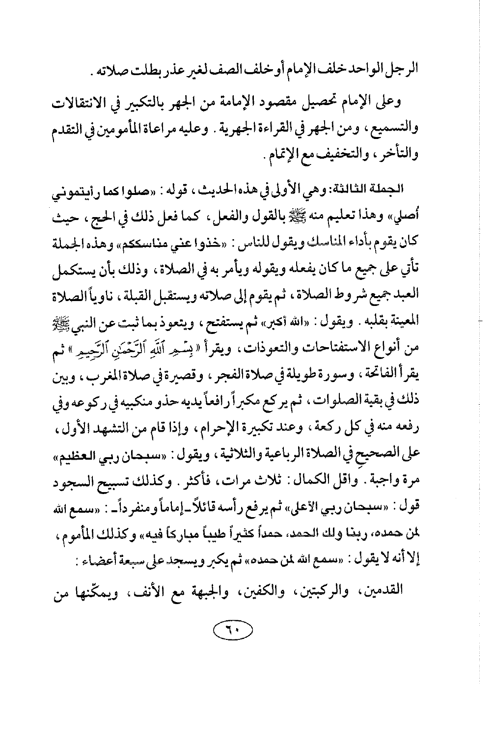 الجملة الثالثة: - وهي الأولى في هذا الحديث - قوله: «صلوا كما رأيتموني أصلي» وهذا تعليم منه صلى الله عليه وسلم بالقول والفعل، كما فعل ذلك في الحج، حيث كان يقوم بأداء المناسك ويقول للناس: «خذوا عني مناسككم» وهذه الجملة تأتي على جميع ما كان يفعله ويقوله ويأمر به في الصلاة، وذلك بأن يستكمل العبد جميع شروط الصلاة (كيفيتها) ، ثم يقوم إلى صلاته ويستقبل القبلة، ناويا الصلاة المعينة بقلبه، ويقول " الله أكبر " ثم يستفتح، ويتعوذ بما ثبت عن النبي صلى الله عليه وسلم من أنواع الاستفتاحات والتعوذات، ويقرأ " بسم الله الرحمن الرحيم " ثم يقرأ الفاتحة، وسورة طويلة في صلاة الفجر، وقصيرة في صلاة المغرب، وبين ذلك في بقية الصلوات، ثم يركع مكبرا رافعا يديه حذو منكبيه في ركوعه وفي رفعه منه في كل ركعة، وعند تكبيرة الإحرام، وإذا قام من التشهد الأول على الصحيح في الصلاة الرباعية والثلاثية، ويقول " سبحان ربي العظيم " مرة واجبة، وأقل الكمال: ثلاث مرات، فأكثر، وكذلك تسبيح السجود قول: " سبحان ربي الأعلى " ثم يرفع رأسه قائلا - إماما ومنفردا -: " سمع الله لمن حمده، ربنا ولك الحمد، حمدا كثيرا طيبا مباركا فيه " وكذلك المأموم، إلا أنه لا يقول: " سمع الله لمن حمده " ثم يكبر ويسجد على سبعة أعضاء: القدمين، والركبتين، والكفين، والجبهة، مع الأنف، ويمكنها من