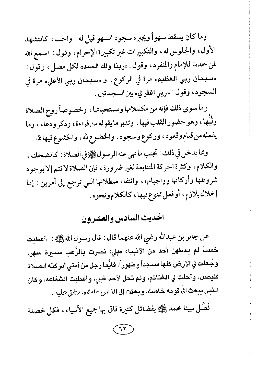 الحديث السادس والعشرون عن جابر بن عبد الله رضي الله عنه قَالَ: قَالَ رَسُولُ اللَّهِ صلى الله عليه وسلم: «أُعْطِيتُ خَمْسًا لَمْ يُعْطَهُنَّ أَحَدٌ مِنَ الْأَنْبِيَاءِ قَبْلِي: نُصِرْتُ بِالرُّعْبِ مَسِيرَةَ شَهْرٍ، وَجُعِلَتْ لِيَ الْأَرْضُ كُلُّهَا مَسْجِدًا وَطَهُورًا، فَأَيُّمَا رَجُلٍ مِنْ أُمَّتِي أَدْرَكَتْهُ الصَّلَاةُ فَلْيُصَلِّ، وَأُحِلَّتْ لي الغنائم، وَلَمْ تَحِلَّ لِأَحَدٍ قَبْلِي، وَأُعْطِيتُ الشَّفَاعَةَ، وَكَانَ النَّبِيُّ يُبْعَثُ إِلَى قَوْمِهِ خَاصَّةً، وَبُعِثْتُ إِلَى الناس عامة» متفق عليه.