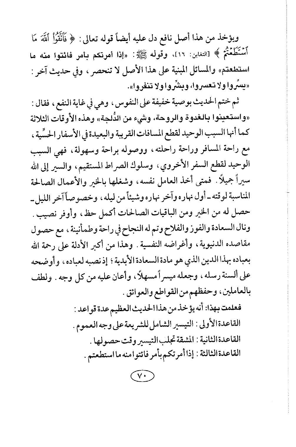 وقوله صلى الله عليه وسلم: «إذا أمرتكم بأمر فائتوا منه ما استطعتم» والمسائل المبنية على هذا الأصل لا تنحصر. وفي حديث آخر «يسروا، ولا تعسروا، وبشروا ولا تنفروا» .