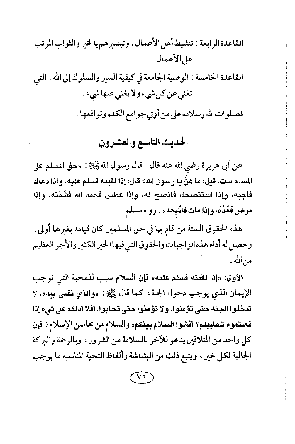 الحديث التاسع والعشرون عن أبي هريرة رضي الله عنه قال: قال رسول الله صلى الله عليه وسلم: «حَقُّ الْمُسْلِمِ عَلَى الْمُسْلِمِ سِتٌّ: قِيلَ: مَا هُنَّ يَا رَسُولَ اللَّهِ؟ قَالَ إِذَا لَقِيتَهُ فَسَلِّمْ عَلَيْهِ، وَإِذَا دَعَاكَ فَأَجِبْهُ، وَإِذَا اسْتَنْصَحَكَ فَانْصَحْ لَهُ، وَإِذَا عَطَسَ فَحَمِدَ اللَّهَ فَشَمِّتْهُ، وَإِذَا مَرِضَ فَعُدْهُ، وَإِذَا مَاتَ فَاتْبَعْهُ» رَوَاهُ مسلم.