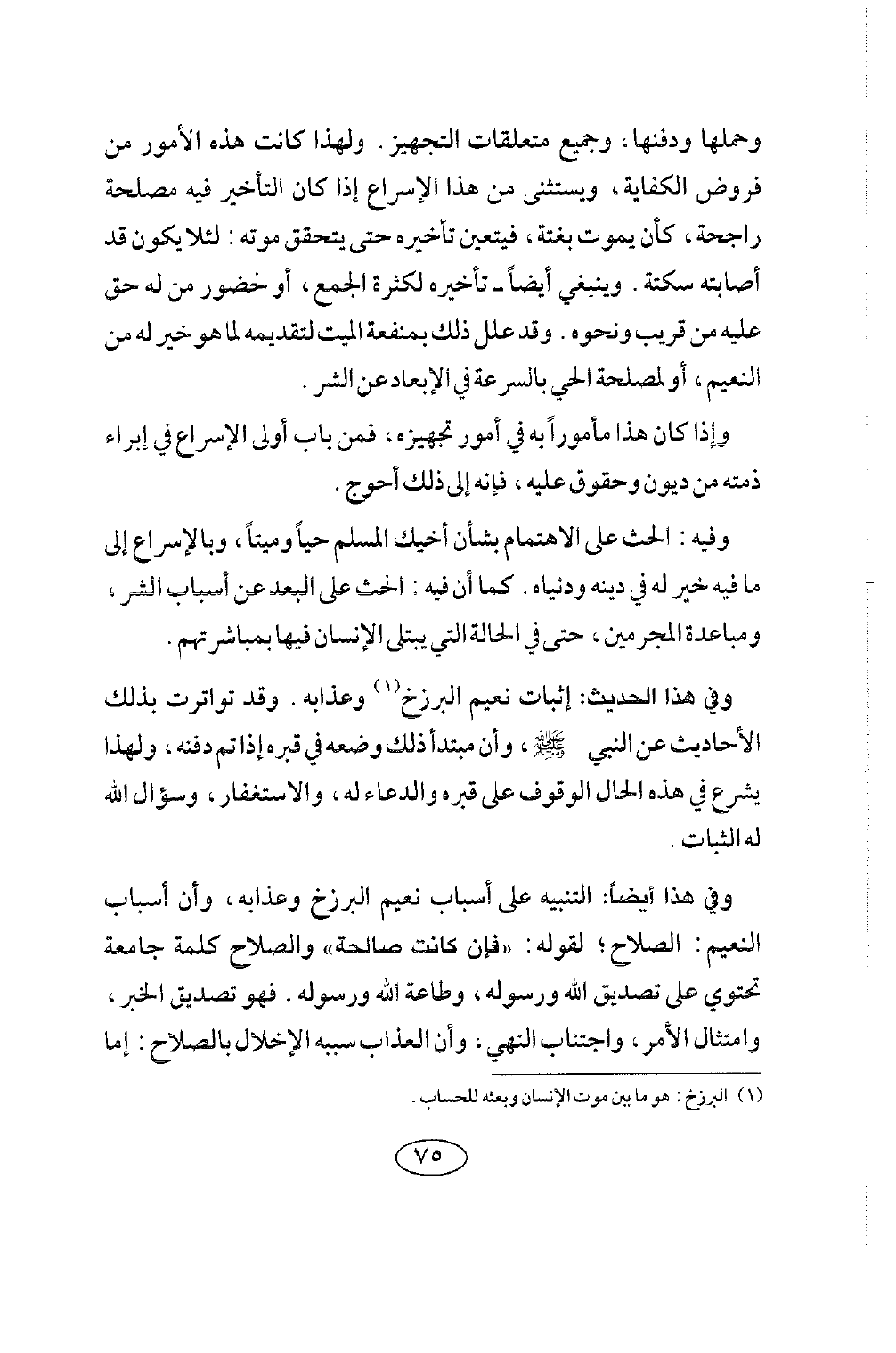 وفي هذا أيضا: التنبيه على أسباب نعيم البرزخ وعذابه، وأن أسباب النعيم الصلاح، لقوله: «فإن كانت صالحة» والصلاح كلمة جامعة تحتوي على تصديق الله ورسوله، وطاعة الله ورسوله، فهو تصديق الخبر، وامتثال الأمر، واجتناب النهي، وأن العذاب سببه الإخلال بالصلاح: إما