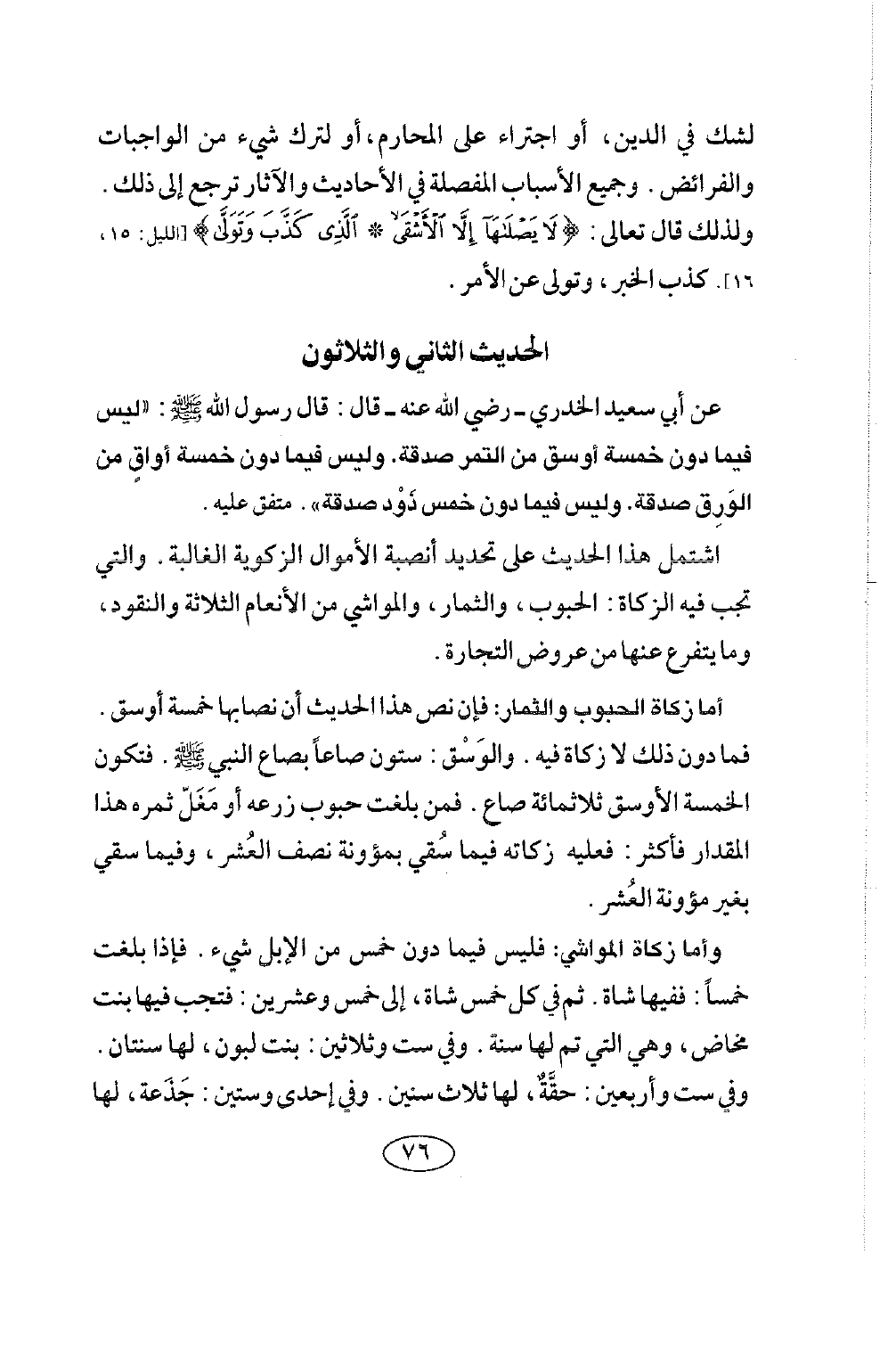 الحديث الثاني والثلاثون عَنْ أَبِي سَعِيدٍ الْخُدْرِيِّ رضي الله عنه قَالَ: قَالَ رَسُولُ اللَّهِ صلى الله عليه وسلم: «لَيْسَ فِيمَا دُونَ خَمْسَةِ أَوْسُقٍ مِنَ التَّمْرِ صَدَقَةٌ، وَلَيْسَ فِيمَا دُونَ خَمْسِ أَوَاقٍ مِنَ الْوَرِقِ صَدَقَةٌ، وَلَيْسَ فِيمَا دُونَ خَمْسِ ذود صدقة» متفق عليه.
