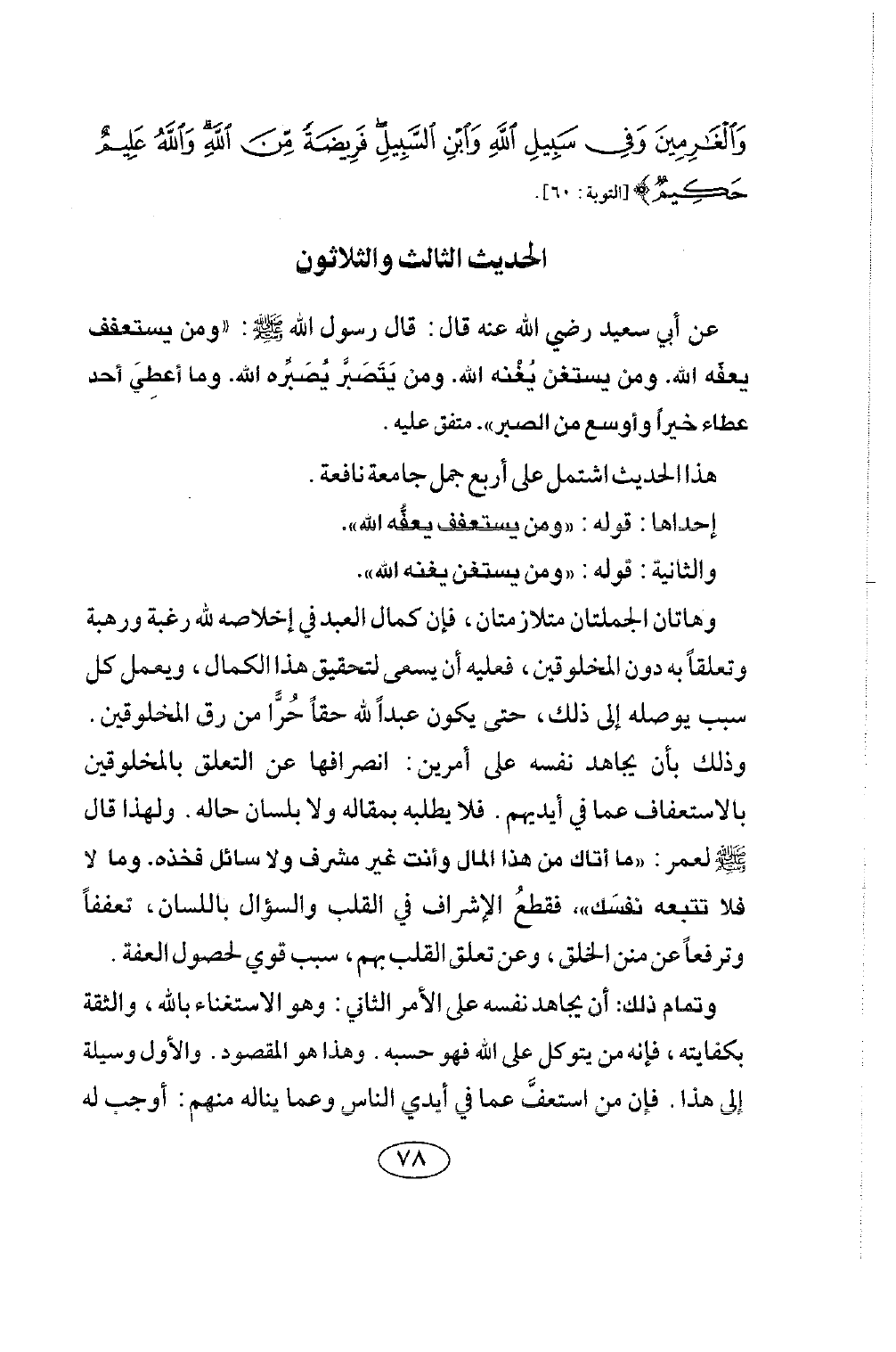 الحديث الثالث والثلاثون عن أبي سعيد رضي الله عنه قَالَ: قَالَ رَسُولُ اللَّهِ صلى الله عليه وسلم: «وَمَنْ يَسْتَعْفِفْ يُعِفَّهُ اللَّهُ، وَمَنْ يَسْتَغْنِ يُغْنِهِ اللَّهُ، وَمَنْ يَتَصَبَّرْ يُصَبِّرْهُ اللَّهُ، وَمَا أُعْطِيَ أَحَدٌ عَطَاءً خَيْرًا وأوسع من الصبر» متفق عليه.