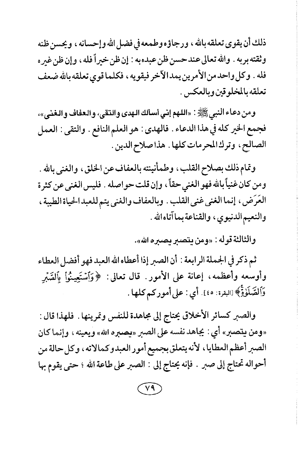 وتمام ذلك بصلاح القلب، وطمأنينته بالعفاف عن الخلق، والغنى بالله، ومن كان غنيا بالله فهو الغني حقا، وإن قلت حواصله، فليس الغنى عن كثرة العرض، إنما الغنى غنى القلب، وبالعفاف والغنى يتم للعبد الحياة الطيبة، والنعيم الدنيوي، والقناعة بما آتاه الله.