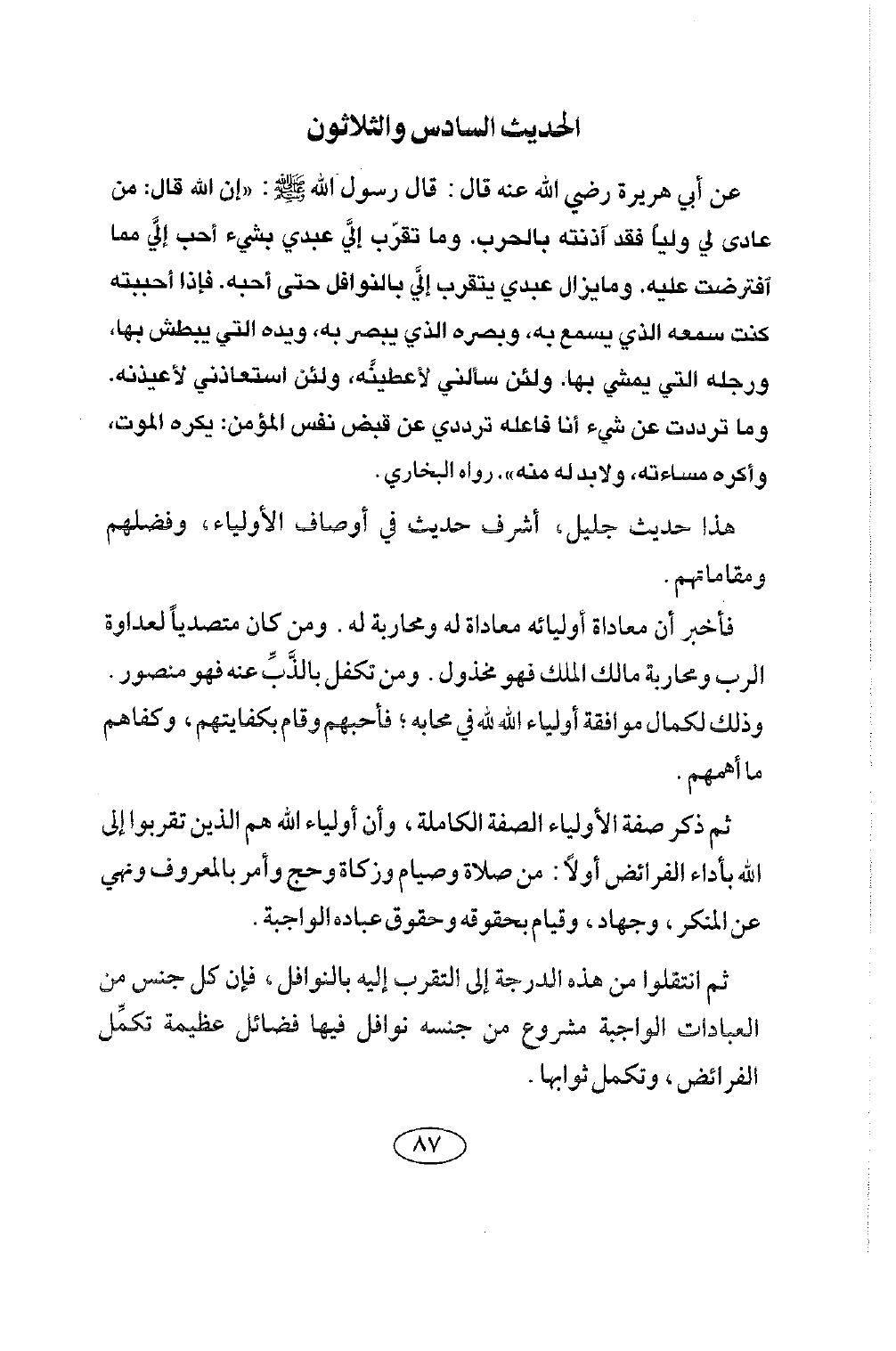 الحديث السادس والثلاثون عن أبي هريرة رضي الله عنه قال: قال رسول الله صلى الله عليه وسلم: «إِنَّ اللَّهَ قَالَ: مَنْ عَادَى لِي وَلِيًّا فقد آذنته بالحرب، وما تقرب إلي عبد بِشَيْءٍ أَحَبَّ إِلَيَّ مِمَّا افْتَرَضْتُ عَلَيْهِ، وَمَا يَزَالُ عَبْدِي يَتَقَرَّبُ إِلَيَّ بِالنَّوَافِلِ حَتَّى أُحِبَّهُ، فَإِذَا أَحْبَبْتُهُ كُنْتُ سَمْعَهُ الَّذِي يَسْمَعُ بِهِ، وَبَصَرَهُ الَّذِي يُبْصِرُ بِهِ، وَيَدَهُ الَّتِي يَبْطُشُ بِهَا، وَرِجْلَهُ الَّتِي يَمْشِي بِهَا، وَلَئِنْ سَأَلَنِي لَأُعْطِيَنَّهُ، وَلَئِنْ اسْتَعَاذَنِي لَأُعِيذَنَّهُ. وَمَا تَرَدَّدْتُ عَنْ شَيْءٍ أَنَا فَاعِلُهُ تَرَدُّدِي عَنْ قَبْضِ نَفْسِ الْمُؤمِنِ، يَكْرَهُ الْمَوْتَ، وَأَكْرَهُ مَسَاءَتَهُ، وَلَا بُدَّ له منه» رواه البخاري.