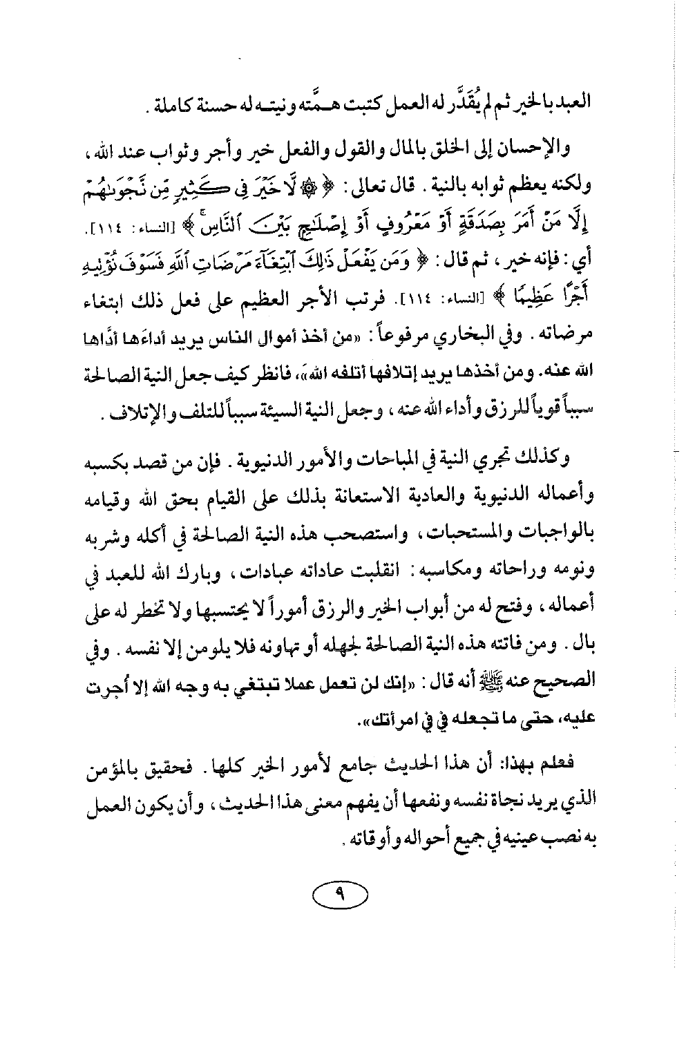 وكذلك تجري النية في المباحات والأمور الدنيوية، فإن من قصد بكسبه وأعماله الدنيوية والعادية الاستعانة بذلك على القيام بحق الله وقيامه بالواجبات والمستحبات، واستصحب هذه النية الصالحة في أكله وشربه ونومه وراحاته ومكاسبه: انقلبت عاداته عبادات، وبارك الله للعبد في أعماله، وفتح له من أبواب الخير والرزق أمورا لا يحتسبها ولا تخطر له على بال. ومن فاتته هذه النية الصالحة لجهله أو تهاونه، فلا يلومن إلا نفسه. وفي الصحيح عنه صلى الله عليه وسلم أنه قال: «إنك لن تعمل عملا تبتغي به وجه الله إلا أجرت عليه، حتى ما تجعله في في امرأتك» .