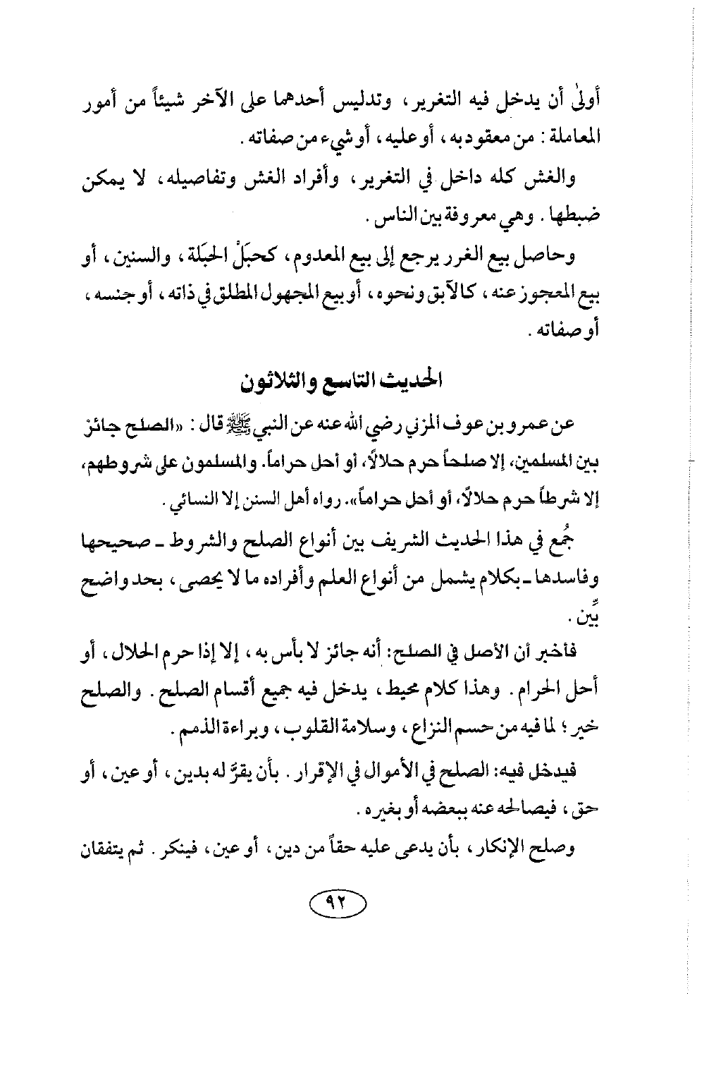 الحديث التاسع والثلاثون عَنْ عَمْرِو بْنِ عَوْفٍ الْمُزَنِيِّ رضي الله عنه عَنِ النَّبِيِّ صلى الله عليه وسلم قَالَ: «الصُّلْحُ جَائِزٌ بَيْنَ الْمُسْلِمِينَ، إِلَّا صُلْحًا حَرَّمَ حَلَالًا، أَوْ أَحَلَّ حَرَامًا. وَالْمُسْلِمُونَ عَلَى شُرُوطِهِمْ، إِلَّا شَرْطًا حَرَّمَ حَلَالًا، أَوْ أَحَلَّ حراما» رواه أهل السنن إلا النسائي.