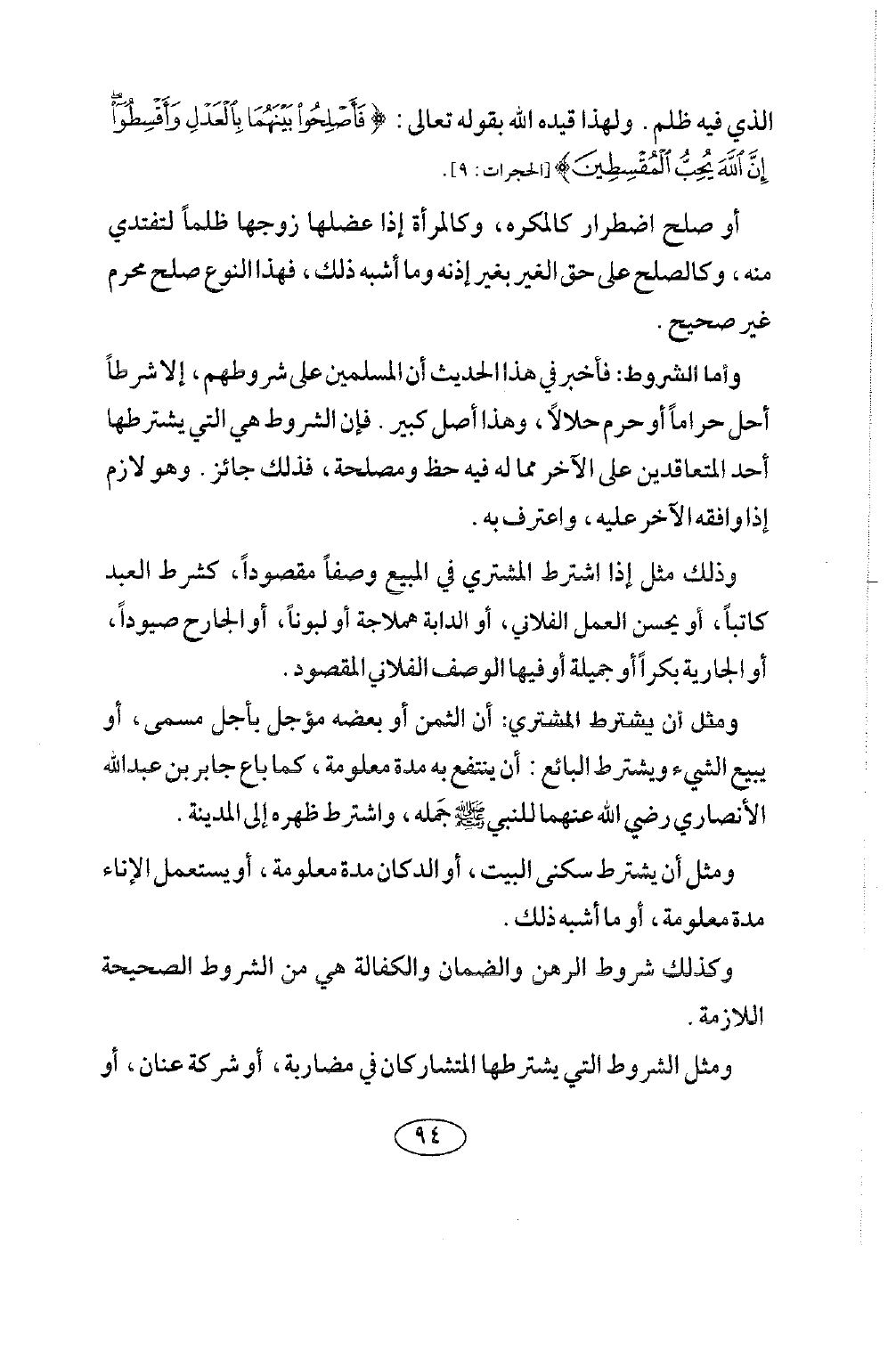 وأما الشروط: فأخبر في هذا الحديث أن المسلمين على شروطهم، إلا شرطا أحل حراما أو حرم حلالا، وهذا أصل كبير، فإن الشروط هي التي يشترطها أحد المتعاقدين على الآخر مما له فيه حظ ومصلحة، فذلك جائز، وهو لازم إذا وافقه الآخر عليه، واعترف به.