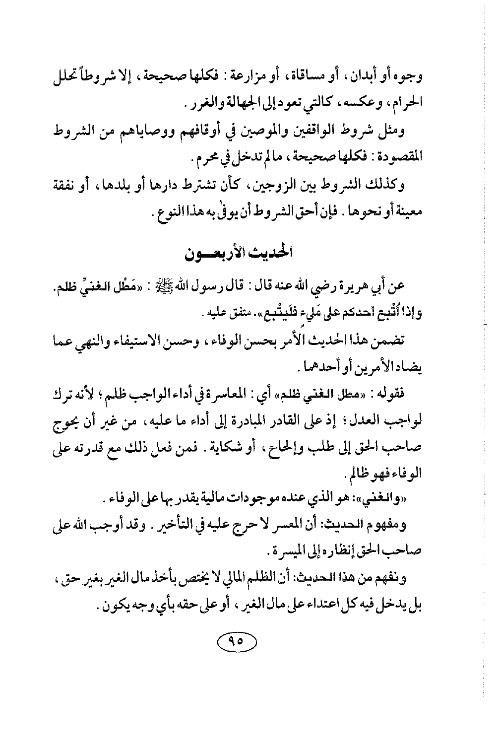 الحديث الأربعون عن أبي هريرة رضي الله عنه قال: قال رسول الله صلى الله عليه وسلم: «مَطْلُ الْغَنِيِّ ظُلْمٌ. وَإِذَا أُتْبِعَ أَحَدُكُمْ عَلَى مليء فليتبع» . متفق عليه.