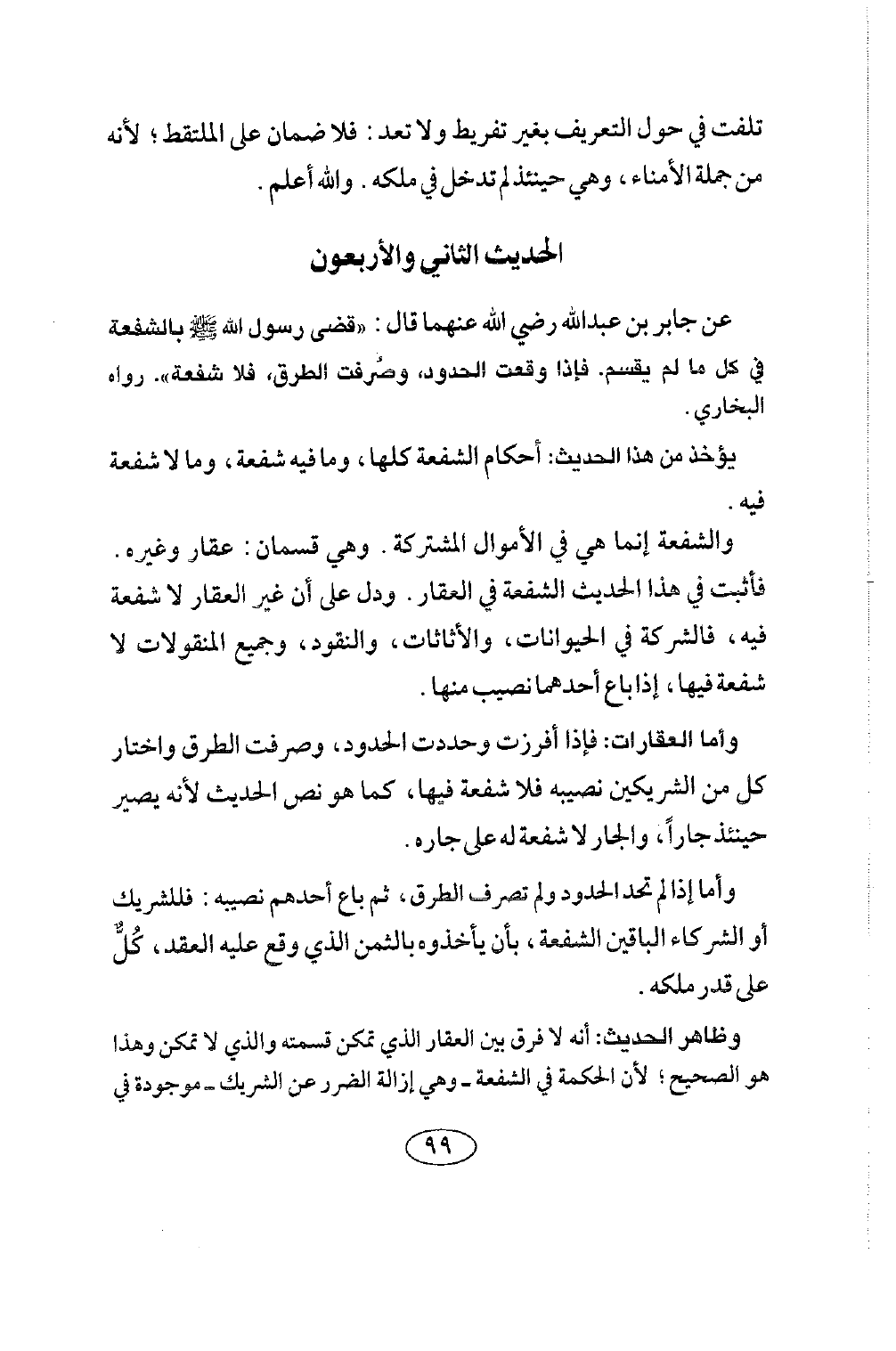 الحديث الثاني والأربعون عن جابر بن عبد الله رضي الله عنه قَالَ: «قَضَى رَسُولُ اللَّهِ صلى الله عليه وسلم بِالشُّفْعَةِ فِي كُلِّ مَا لَمْ يُقْسَمْ. فَإِذَا وَقَعَتِ الْحُدُودُ، وَصُرِّفَتِ الطُّرُقُ، فَلَا شُفْعَةَ» رواه البخاري.