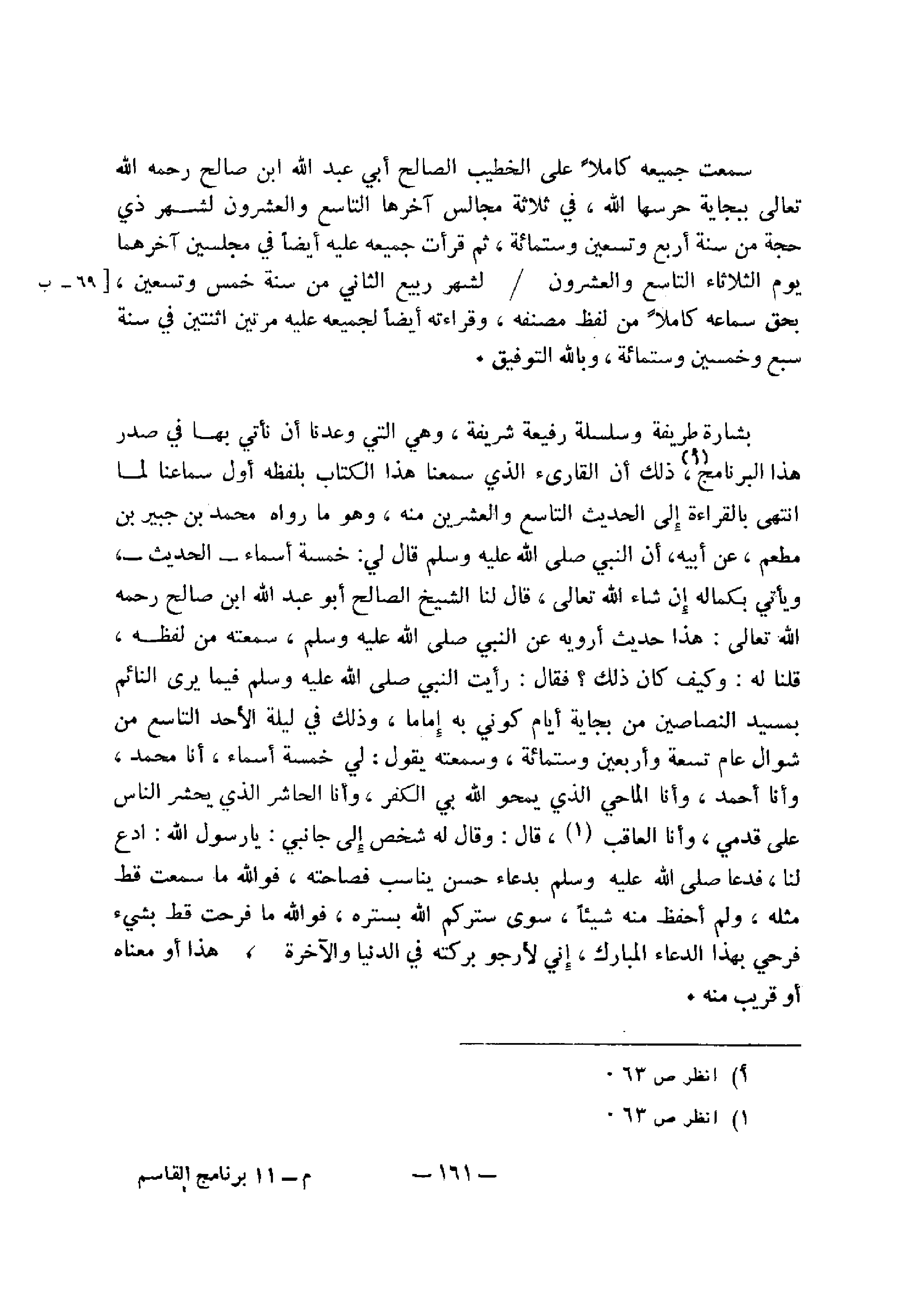 الْحَدِيثَ وَيَأْتِي بِكَمَالٍ إِنْ شَاءَ اللَّهُ تَعَالَى، قَالَ لَنَا الشَّيْخُ الصَّالِحُ أَبُو عَبْدِ اللَّهِ بْنُ صَالِحٍ رَحِمَهُ اللَّهُ تَعَالَى، هَذَا حَدِيثٌ أَرْوِيهِ عَنِ النَّبِيِّ صَلَّى اللَّهُ عَلَيْهِ وَسَلَّمَ، سَمِعْتُهُ مِنْ لَفْظِهِ، قُلْنَا لَهُ: وَكَيْفَ كَانَ ذَلِكَ؟ فَقَالَ: " رَأَيْتُ النَّبِيَّ صَلَّى اللَّهُ عَلَيْهِ وَسَلَّمَ فِيمَا يَرَى النَّائِمُ بِمَسْجِدِ النَّصَّاصِينَ مِنْ بِجَايَةَ أَيَّامَ كَوْنِي بِهِ إِمَامًا، وَذَلِكَ فِي لَيْلَةِ الْأَحَدِ التَّاسِعَ مِنْ شَوَّالٍ عَامَ تِسْعَةٍ وَأَرْبَعِينَ وَسِتِّ مِائَةٍ، وَسَمِعْتُهُ يَقُولُ: لِي خَمْسَةُ أَسْمَاءٍ، أَنَا مُحَمَّدٌ، وَأَنَا أَحْمَدُ، وَأَنَا الْمَاحِي الَّذِي يَمْحُو اللَّهُ بِيَ الْكُفْرَ، وَأَنَا الْحَاشِرُ الَّذِي يُحْشَرُ النَّاسُ عَلَى قَدَمِي، وَأَنَا الْعَاقِبُ، قَالَ: وَقَالَ لَهُ شَخْصٌ إِلَى جَانِبِي: يَا رَسُولَ اللَّهِ: ادْعُ لَنَا، فَدَعَا صَلَّى اللَّهُ عَلَيْهِ وَسَلَّمَ بِدُعَاءٍ حَسَنٍ يُنَاسِبُ فَصَاحَتَهُ، فَوَاللَّهِ مَا سَمِعْتُ قَطُّ مِثْلَهُ، وَلَمْ أَحْفَظْ مِنْهُ شَيْئًَا، سِوَى سَتَرَكُمُ اللَّهُ بِسَتْرِهِ، فَوَاللَّهِ مَا فَرِحْتُ قَطُّ بِشَيْءٍ فَرَحِي بِهَذَا الدُّعَاءِ الْمُبَارَكِ، إِنِّي لَأَرْجُو بَرَكَتَهُ فِي الدُّنْيَا وَالْآخِرَةِ، هَذَا أَوْ مَعْنَاهُ أَوْ قَرِيبٌ مِنْهُ "