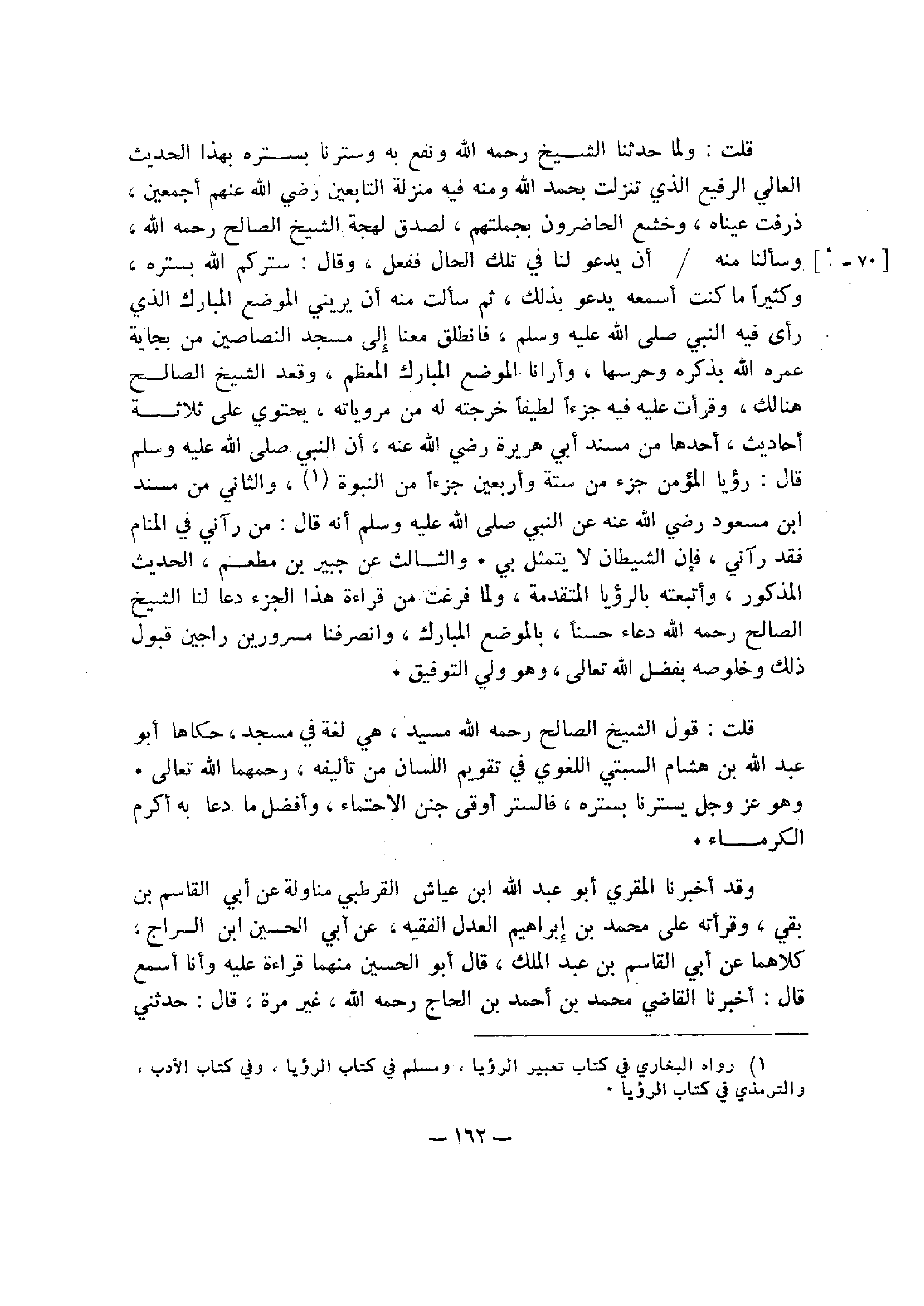 قُلْتُ: وَلَمَّا حَدَّثَنَا الشَّيْخُ رَحِمَهُ اللَّهُ وَنُفِعَ بِهِ وَسَتَرَنَا بِسَتْرِهِ بِهَذَا الْحَدِيثِ الْعَالِي الرَّفِيعِ الَّذِي تَنَزَّلَتْ بِحَمْدِ اللَّهِ وَمِنْهُ فِيهِ مَنْزِلَةُ التَّابِعِينَ رَضِيَ اللَّهُ عَنْهُمْ أَجْمَعِينَ، ذَرَفَتْ عَيْنَاهُ، وَخَشَعَ الْحَاضِرُونَ بِجُمْلَتِهِمْ، لِصِدْقِ لَهْجَةِ الشَّيْخِ الصَّالِحِ رَحِمَهُ اللَّهُ، وَسَأَلْنَا مِنْهُ أَنْ يَدْعُوَ لَنَا تِلْكَ الْحَالَ فَفَعَلَ، وَقَالَ: سَتَرَكُمُ اللَّهُ بِسَتْرِهِ، وَكَثِيرًا مَا كُنْتُ أَسْمَعُهُ يَدْعُو بِذَلِكَ، ثُمَّ سَأَلْتُ مِنْهُ أَنْ يُرِيَنِي الْمَوْضِعَ الْمُبَارَكَ الَّذِي رَأَى فِيهِ النَّبِيَّ صَلَّى اللَّهُ عَلَيْهِ وَسَلَّمَ، فَانْطَلَقَ مَعَنَا إِلَى مَسْجِدِ النَّصَّاصِينَ مِنْ بِجَايَةَ عَمَّرَهُ اللَّهُ بِذِكْرِهِ وَحَرَسَهَا، وَأَرَانَا الْمَوْضِعَ الْمُبَارَكَ الْمُعَظَّمَ، وَقَعَدَ الشَّيْخُ الصَّالِحُ هُنَالِكَ، وَقَرَأْتُهُ عَلَيْهِ فِيهِ جُزْءًا لَطِيفًا خَرَّجْتُهُ لَهُ مِنْ مَرْوِيَّاتِهِ، يَحْتَوِي عَلَى ثَلَاثِ أَحَادِيثَ، أَحَدُهَا مِنْ مُسْنَدِ أَبِي هُرَيْرَةَ رَضِيَ اللَّهُ عَنْهُ، أَنَّ النَّبِيَّ صَلَّى اللَّهُ عَلَيْهِ وَسَلَّمَ، قَالَ: رُؤْيَا الْمُؤْمِنِ جُزْءٌ مِنْ سِتَّةٍ وَأَرْبَعِينَ جُزْءًا مِنَ النُّبُوَّةِ , وَالثَّانِي مِنْ مُسْنَدِ ابْنِ مَسْعُودٍ رَضِيَ اللَّهُ عَنْهُ، عَنِ النَّبِيِّ صَلَّى اللَّهُ عَلَيْهِ وَسَلَّمَ، أَنَّهُ قَالَ: مَنْ رَآنِي فِي الْمَنَامِ فَقَدْ رَآنِي، فَإِنَّ الشَّيْطَانَ لَا يَتَمَثَّلُ بِي , وَالثَّالِثُ عَنْ جُبَيْرِ بْنِ مُطْعَمٍ، الْحَدِيثُ الْمَذْكُورُ وأتبعته بالرؤيا المتقدمة، ولما فرغت من قراءة هذا الجزء دعا لنا الشيخ الصالح رحمه الله دعاء حسنًا، بالموضع المبارك، وانصرفنا مسرورين راجين قبول ذلك وخلوصه بفضل الله تعالى، وهو ولي التوفيق.
