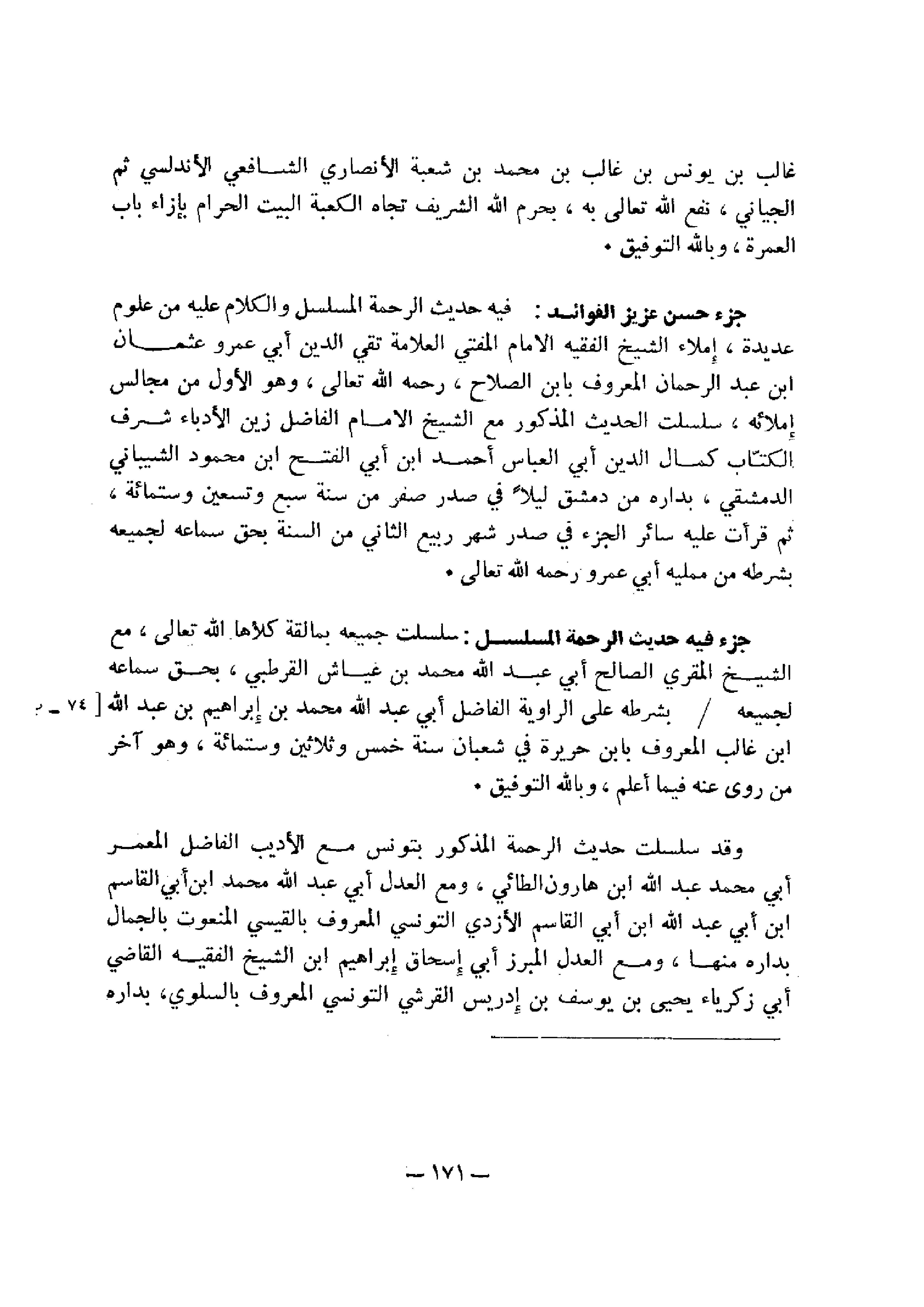 وقد سلسلت حديث الرحمة المذكور بتونس مع الأديب الفاضل المعمر أبي محمد عبد الله ابن هارون الطائي، ومع العدل أبي عبد الله محمد بن أبي القاسم ابن أبي عبد الله بن أبي القاسم الأزدي التونسي المعروف بالقيسي المنعوت بالجمال بدراه منها، ومع العدل المبرز أبي إسحاق إبراهيم بن الشيخ الفقيه القاضي أبي زكرياء يحيى بن يوسف بن إدريس القرشي التونسي المعروف بالسلوي، بداره
