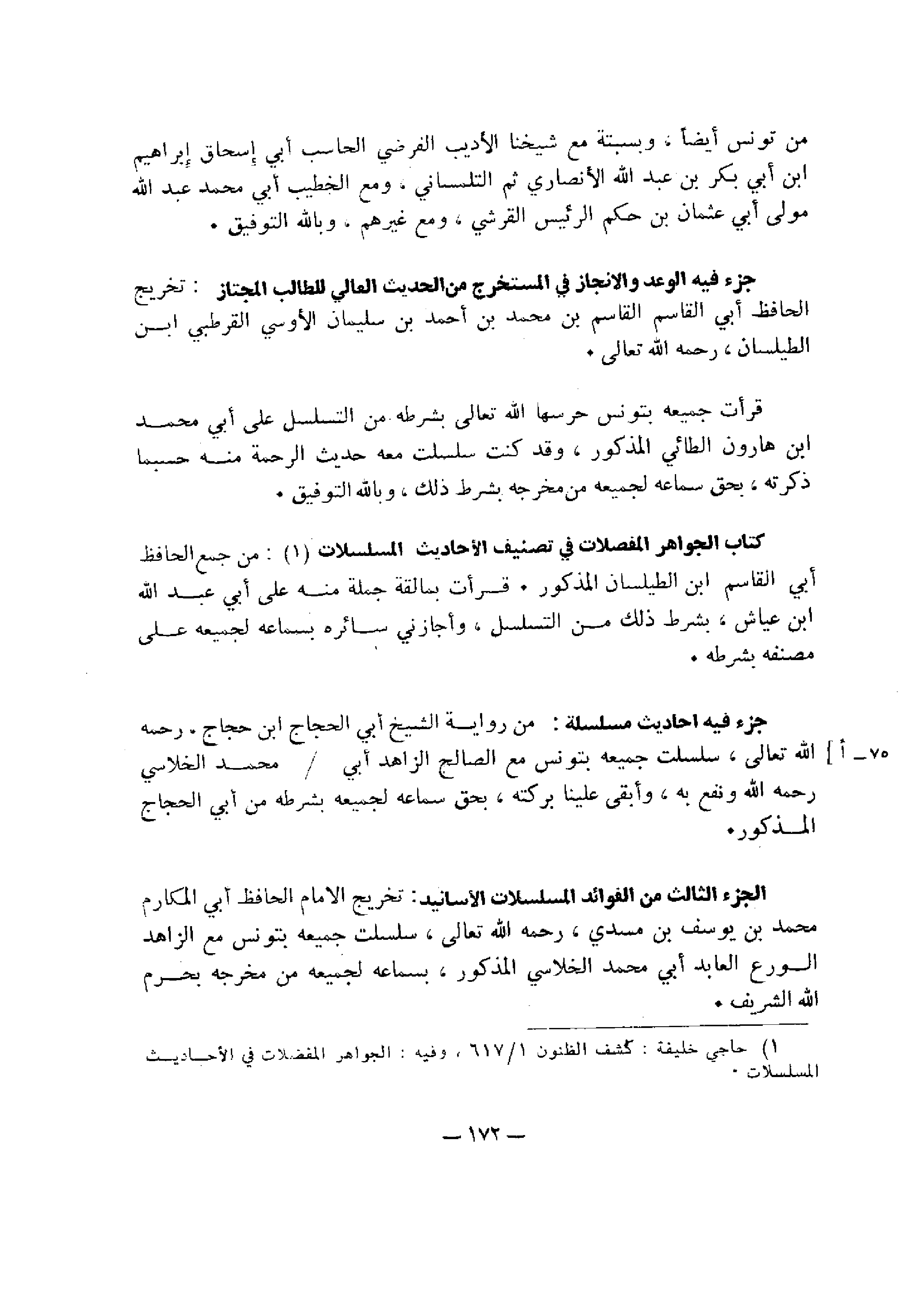 كتاب الجواهر المفصلان في تصنيف الأحاديث المسلسلات: من جمع الحافظ أبي القاسم بن الطيلسان المذكور.