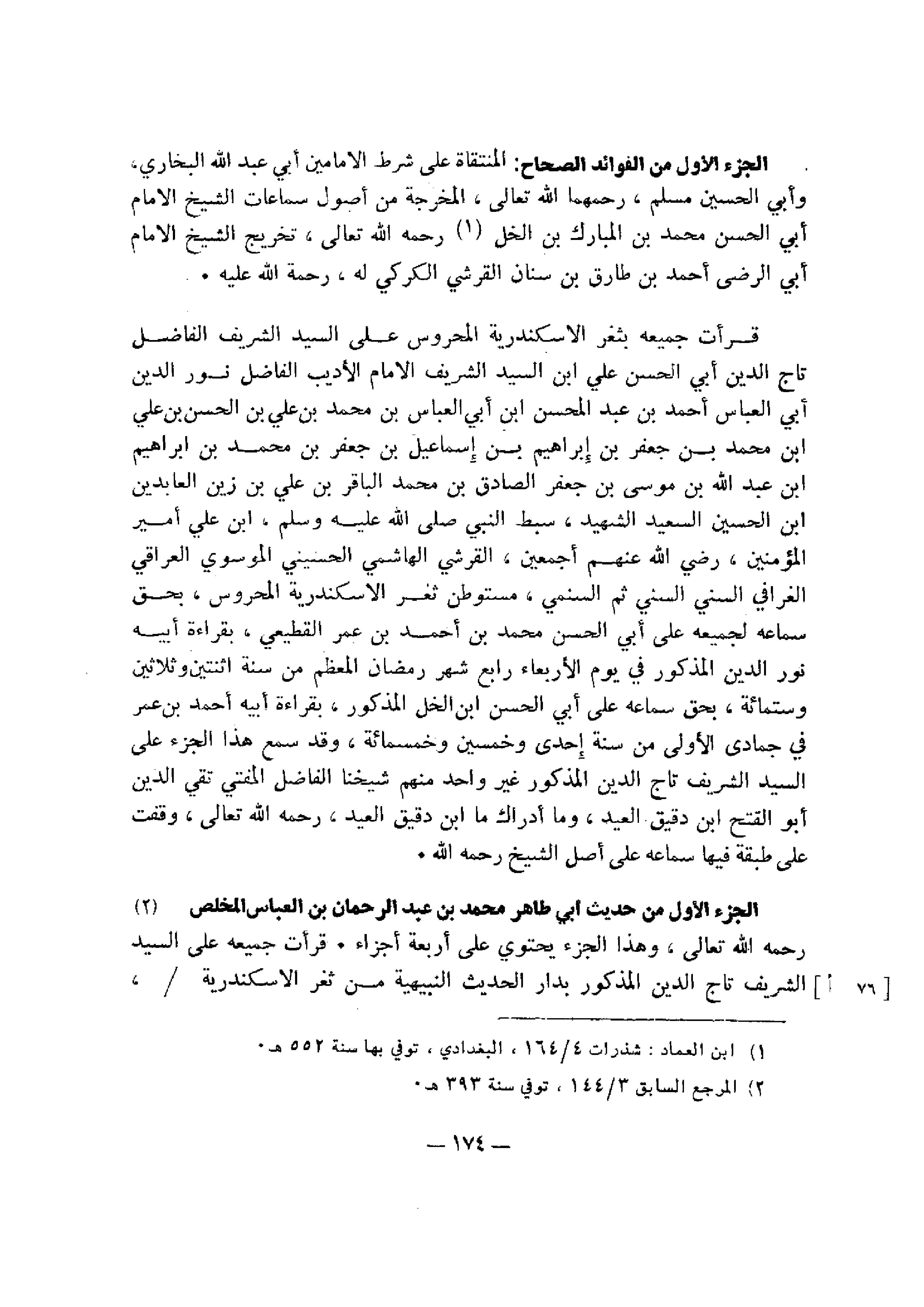 قرأت جميعه بثغر الإسكندرية المحروس علي السيد الشريف الفاضل تاج الدين أبي الحسن علي بن السيد الشريف الإمام الأديب الفاضل نور الدين أبي العباس أحمد بن عبد المحسن بن أبي العباس بن محمد بن علي بن الحسن بن علي بن محمد بن جعفر بن إبراهيم بن إسماعيل بن جعفر بن محمد بن إبراهيم بن عبد الله بن موسي بن جعفر الصادق بن محمد الباقر بن علي بن زين العابدين بن الحسين السعيد الشهيد، سبط النبي صلى الله عليه وسلم، بن علي أمير المؤمنين، رَضي اللهُ عَنْهم أجمعين، مستوطن ثغر الإسكندرية المحروس: بحق سماعه لجميعه علي أبي الحسن محمد بن أجمد بن عمر القطيعي، بقراءة أبيه نور الدين المذكور في يوم الأربعاء رابع شهر رمضان المعظم من سنة اثنتين وثلاثين وست مائة، بحق سماعه علي أبي الحسن ابن الخل المذكور، بقراءة أبيه أحمد بن عمر في جمادي الأولي من سنة إحدى وخمسين وخمس مائة، وقد سمع هذا الجزء علي السيد الشريف تاج الدين المذكور غير واحدا منهم شيخنا الفاضل المفتي تقي الدين أبو الفتح ابن دقيق العيد، وما أدراك ما ابن دقيق العبد، رحمه الله تعالى، وقفت علي طبقة فيها سماعه علي أصل الشيخ رحمه الله.