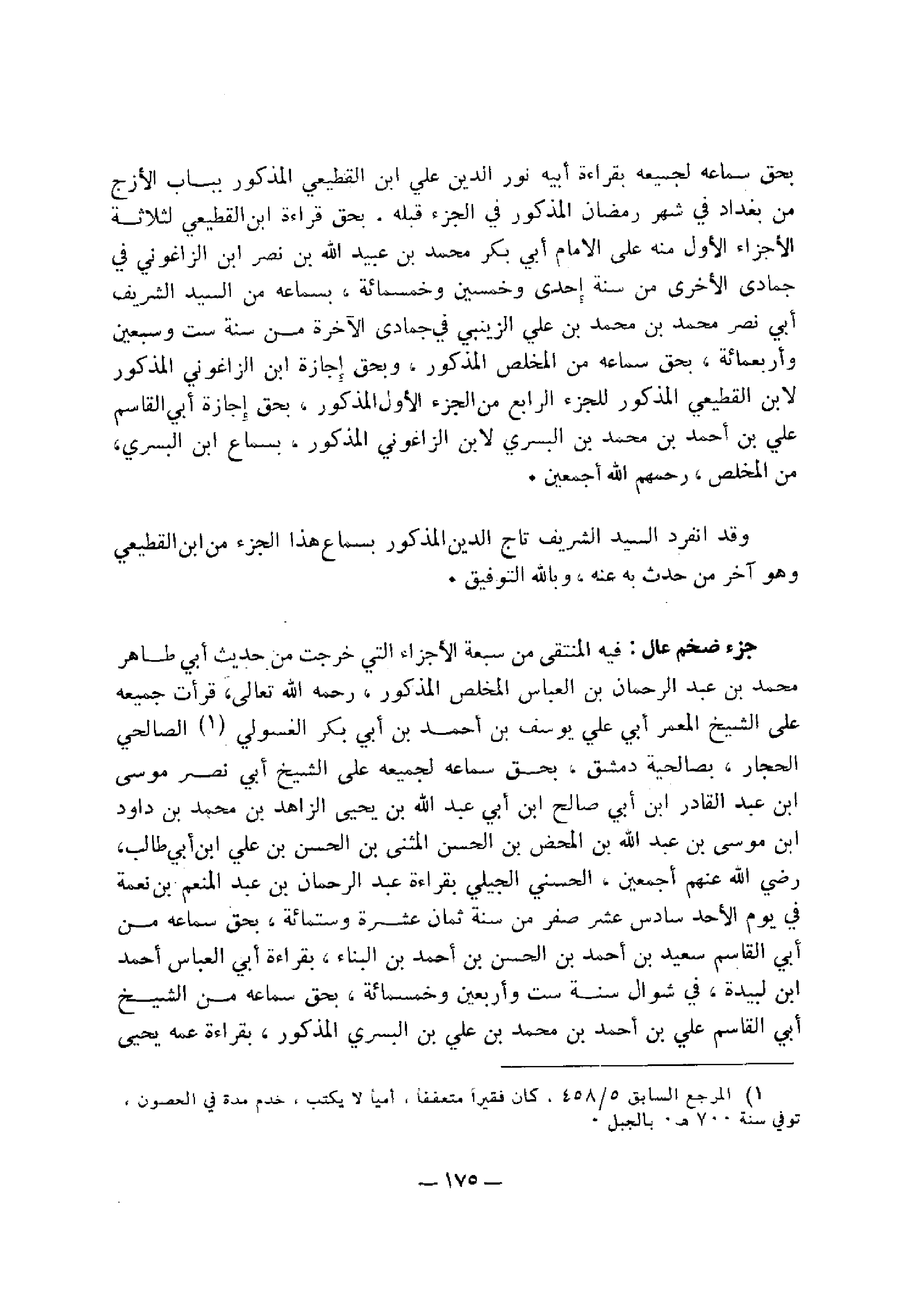 بحق سماعه لجميع بقراءة أبيه نور الدين علي بن القطيعي المذكور بباب الأرج من بغداد في شهر رمضان المذكور في الجزء قبله، بحق قراءة ابن القطيعي لثلاثة الأجزاء الأول منه علي الإمام أبي بكر محمد بن عبيد الله بن نصر بن الزاغوني في جمادي الأخري من سنة إحدى وخمسين وخمس مائة، بسماعه من السيد الشريف أبي نصر محمد بن محمد بن علي الزينبي في جمادي الآخر من سنة ست وسبعين وأربع مائة، بحق سماعه من المخلص المذكور، وبحق إجازة ابن الزاغوني المذكور لابن القطيعي المذكور للجزء الرابع من الجزء الأول المذكور.
